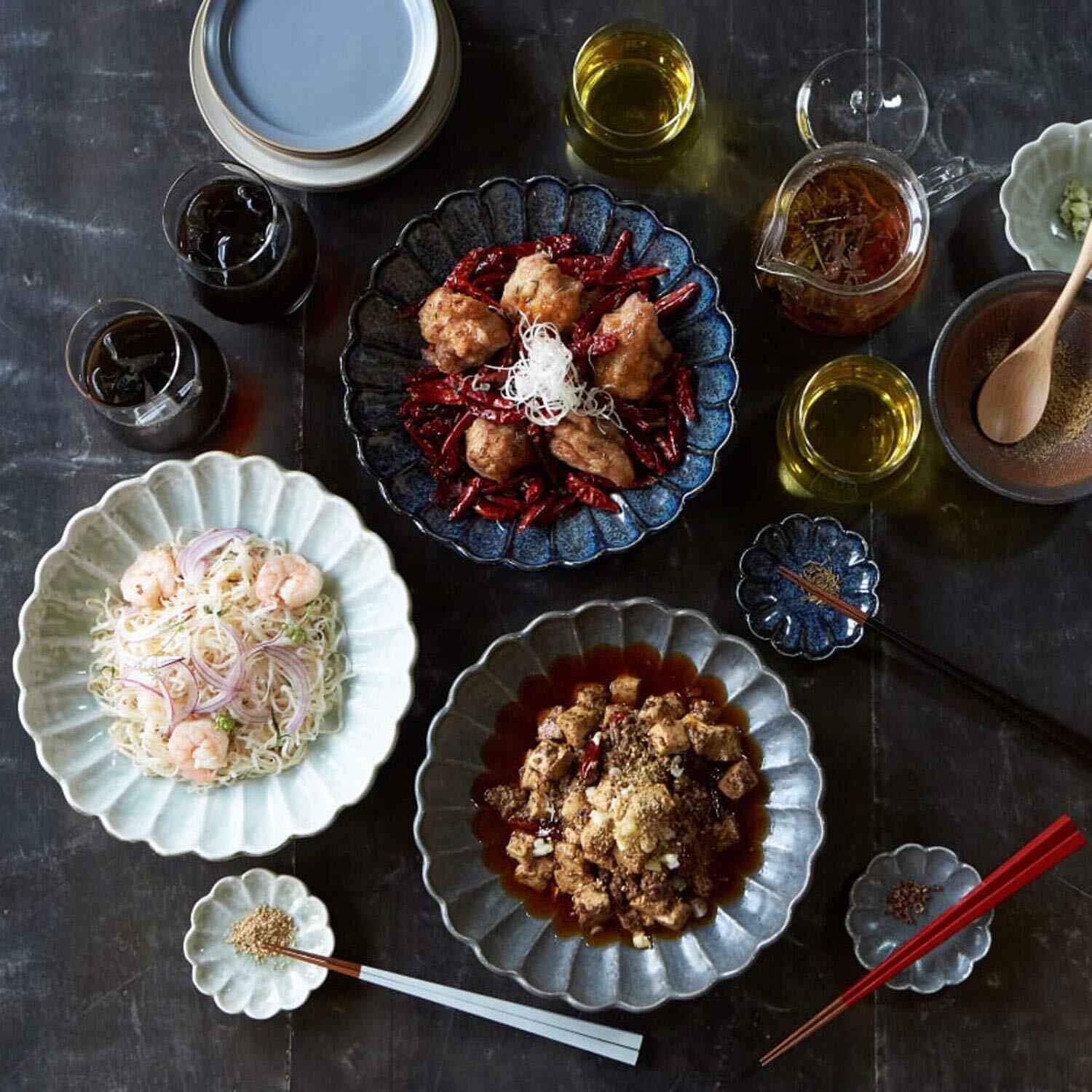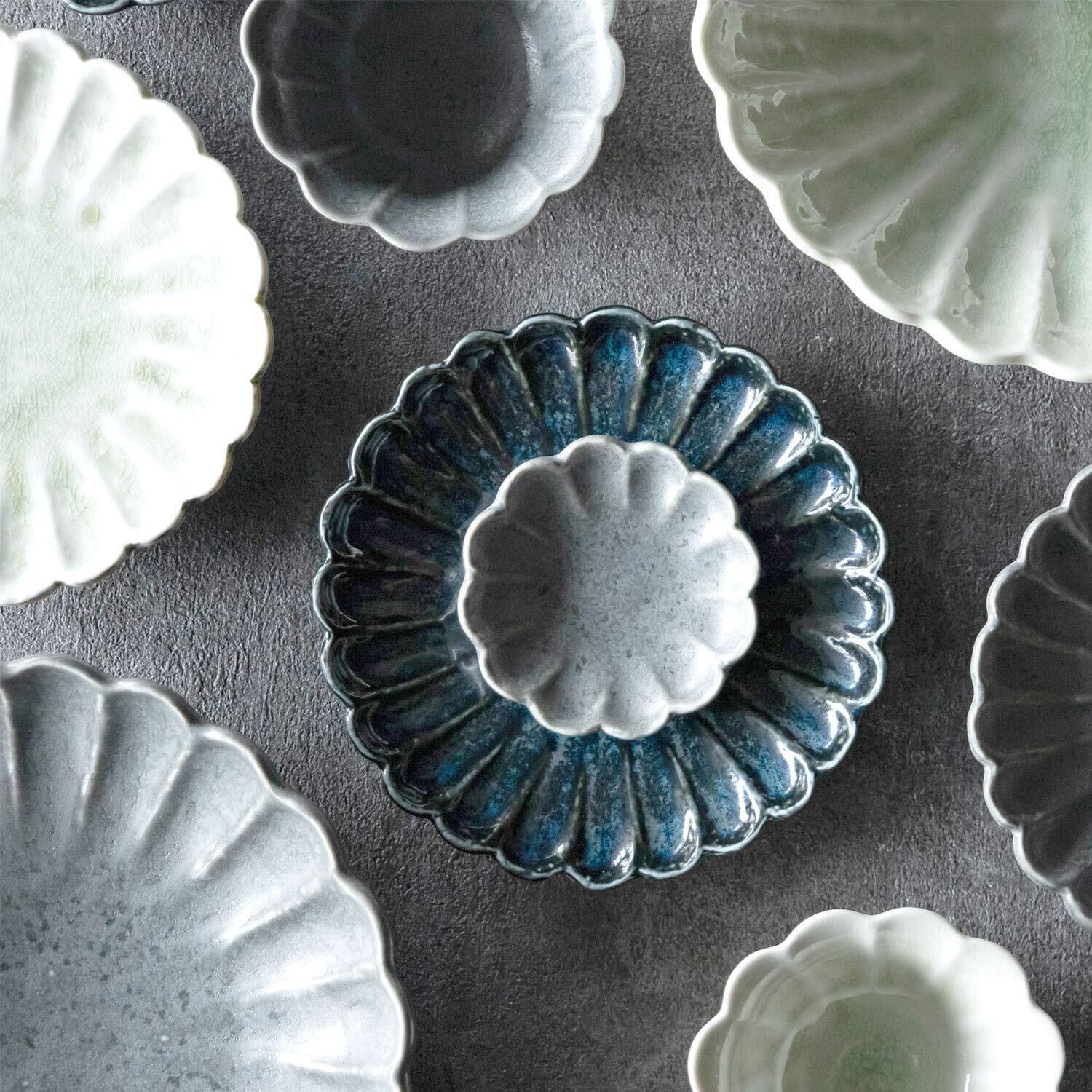 テーブルに映える輪花皿。盛り付けた料理を引き立てる花形は、もはや和食器の定番。しっとり厚みのある重厚感に、窯変の濃淡のムラや貫入が味わい深いお皿です。どんなテーブルも華やかにしてくれます。