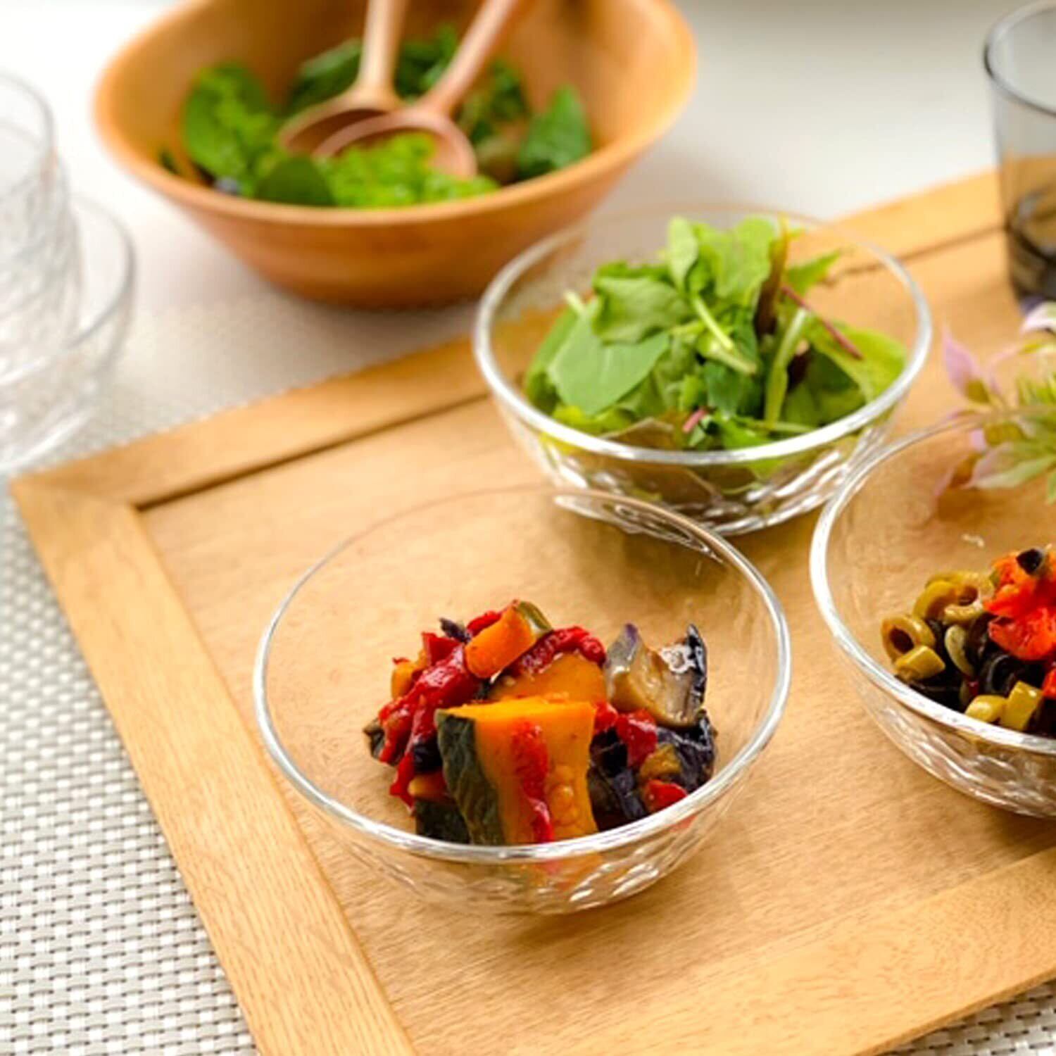 ●透明感のある柔らかな輝き、ガラス模様の風合いがメニューを引き立てるボウル