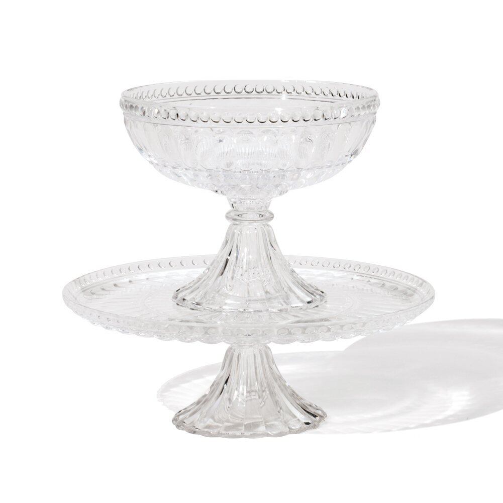 花びらのような模様を全体に施したステムつきのボウルとプレート。いつものテーブルコーディネートにプラスするだけで高さが生まれ一層華やかに、また重ねることで2段のスタンドとしても使うことができます。ステムは取りはずせるので、積み重ねてコンパクトに収納可能。持ち運びにも便利です。焼き菓子やフルーツなどの盛り付けにはもちろん、アクセサリーなどの小物を置くディスプレイ台としてもおすすめです。