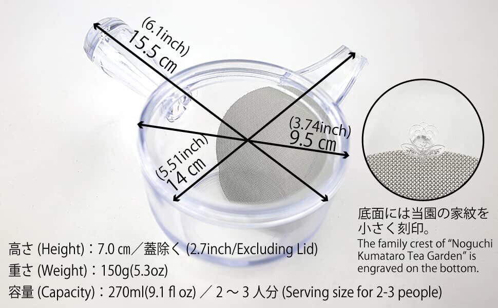 【新春セール】割れない透明急須 クリア(野口熊太郎茶園限定ロゴ入り) お茶の淹れ方リーフレット付き 日本製 プラスチック製 緑茶・紅茶・ほうじ茶・烏龍茶・ハーブティー対応 水出し・氷出し対応 食器洗浄機可 漂白剤可
