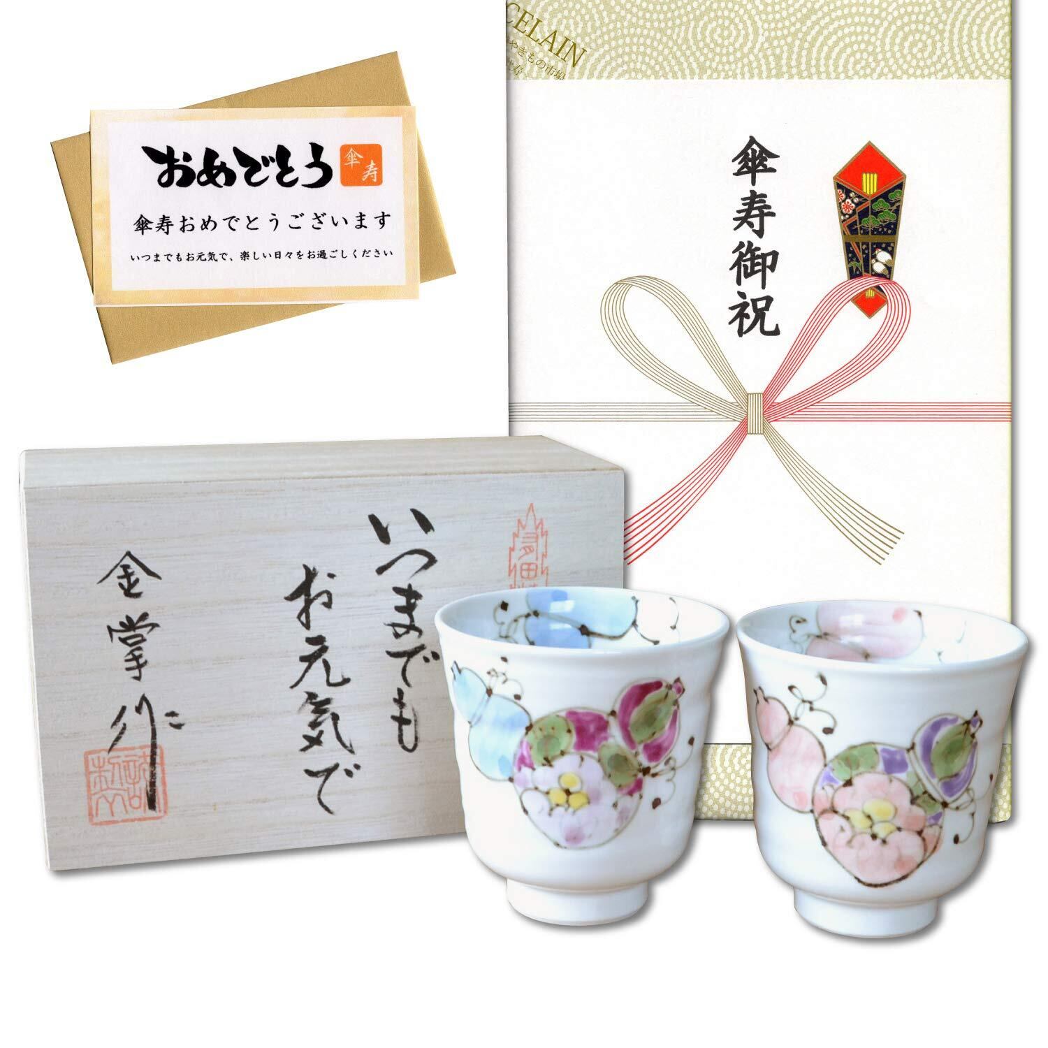 【特価セール】傘寿祝い 夫婦湯呑 無病息災を願った縁起物ギフト 有田焼 湯呑み ペア のし・メッセージカード付き 木箱入り 花六瓢