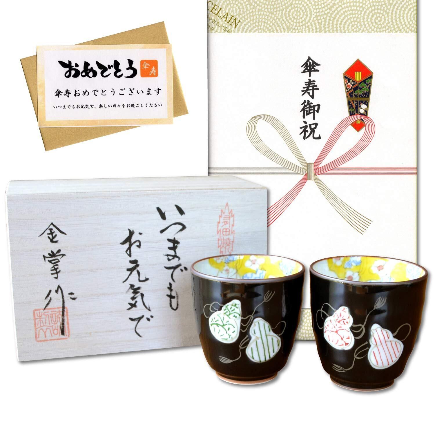 傘寿祝い 夫婦湯呑 無病息災を願った縁起物ギフト 有田焼 湯呑み ペア のし・メッセージカード付き 木箱入り 六瓢色彩