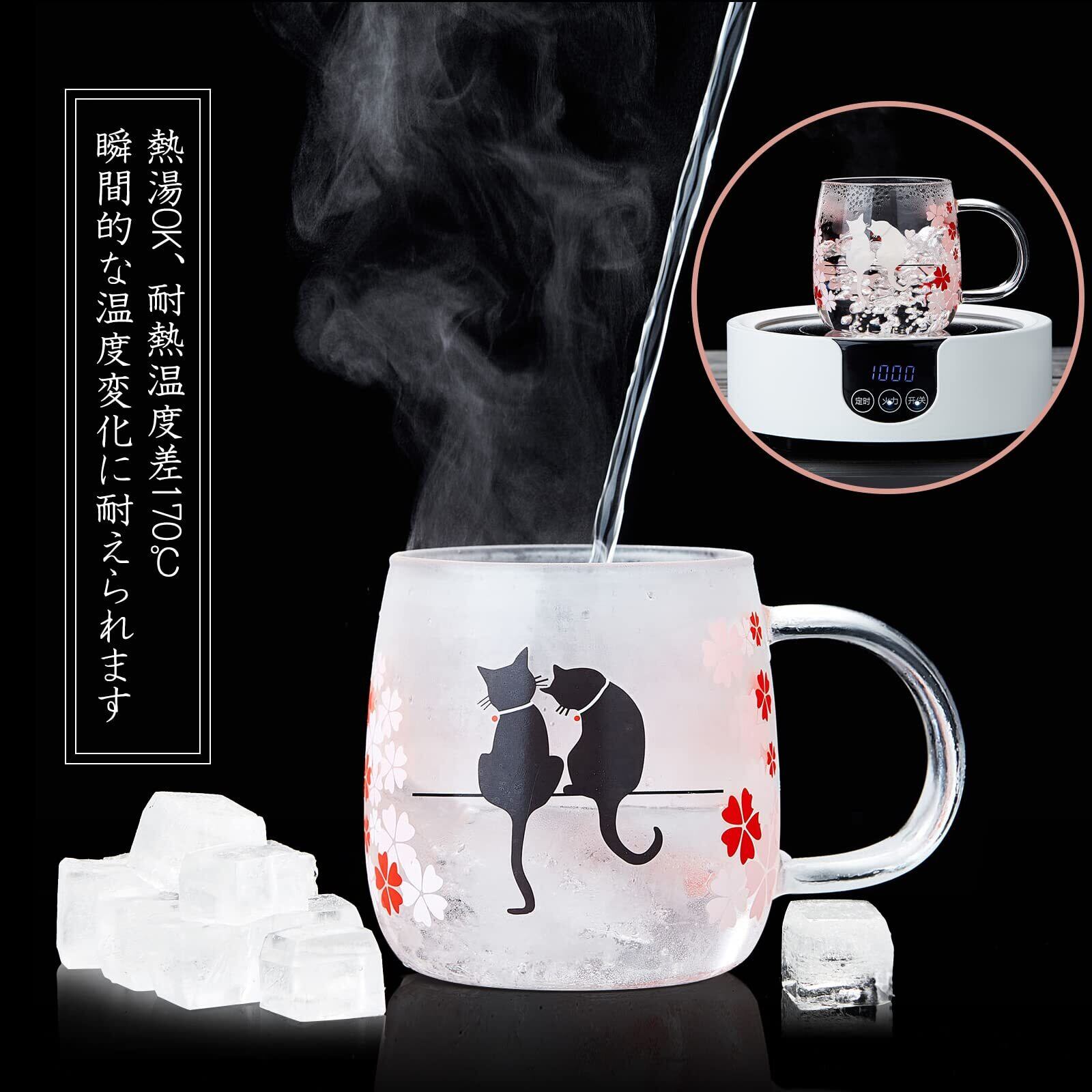 ポカロティー 耐熱ガラス茶こし付きマグカップ 透明 紅茶 温度で色が変わる桜猫カップ 和桜 春の日 桜満開 不思議な猫 幸せ 取手蓋付き 恋愛結婚誕生日記念日お祝い 満水容量 480ml (適正 400ml)