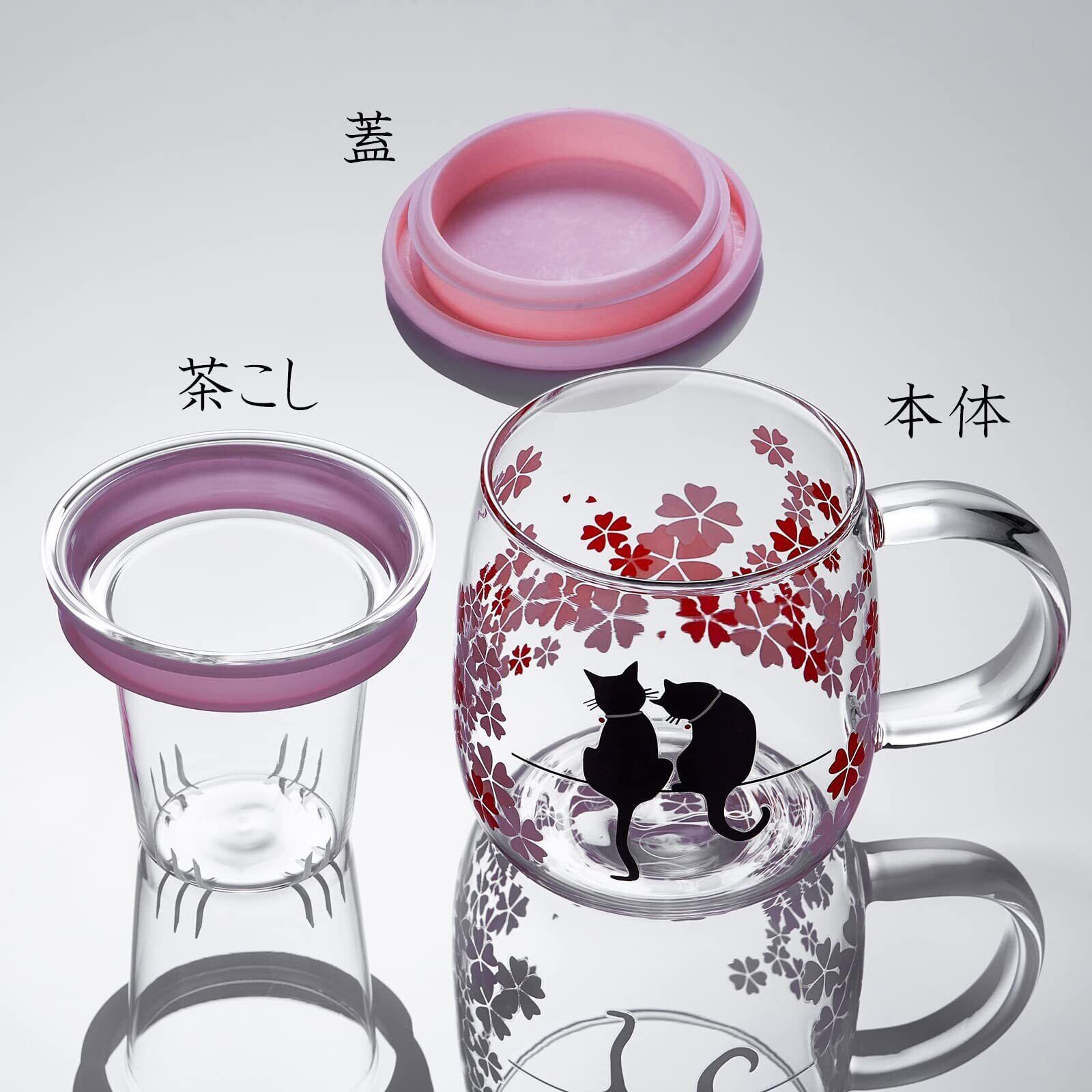 【特価商品】ポカロティー 耐熱ガラス茶こし付きマグカップ 透明 紅茶 温度で色が変わる桜猫カップ 和桜 春の日 桜満開 不思議な猫 幸せ 取手蓋付き 恋愛結婚誕生日記念日お祝い 満水容量 480ml (適正 400ml)
