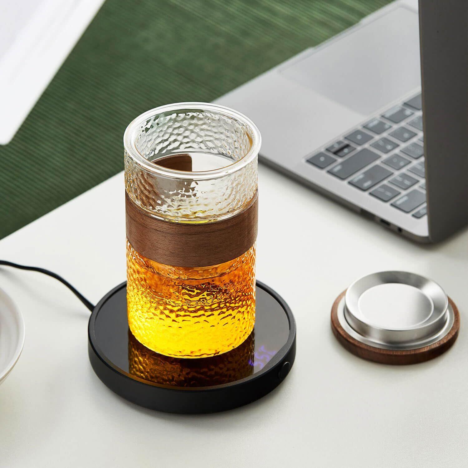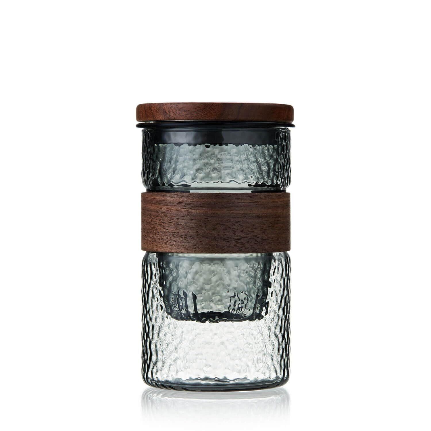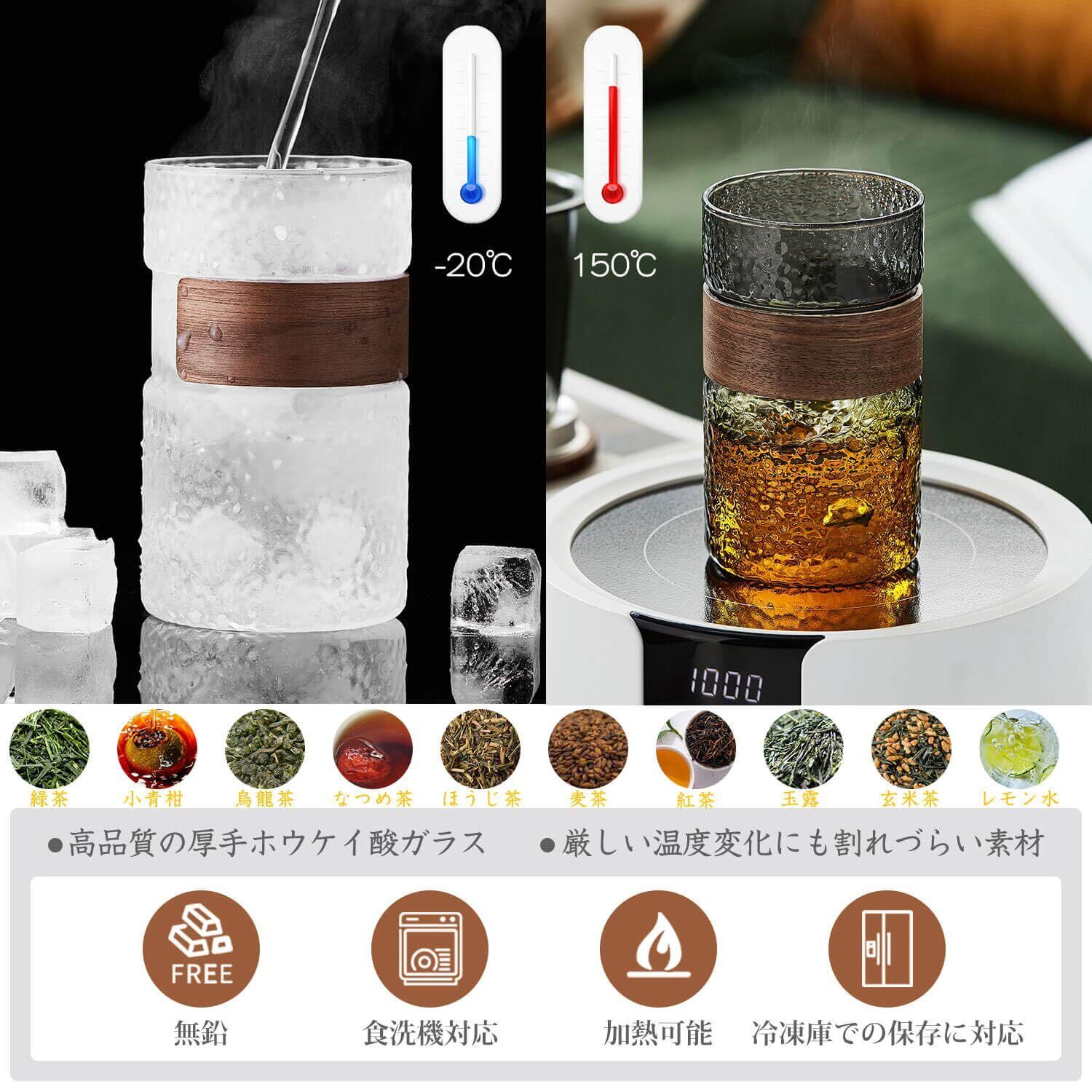 ポカロティー ティーカップ 耐熱ガラス 墨色槌目 460ml ガラスカップ 茶こし付き 木製フタ付き おしゃれ 耐熱 茶器 紅茶 緑茶 仕事中 水分補給 ギフト用