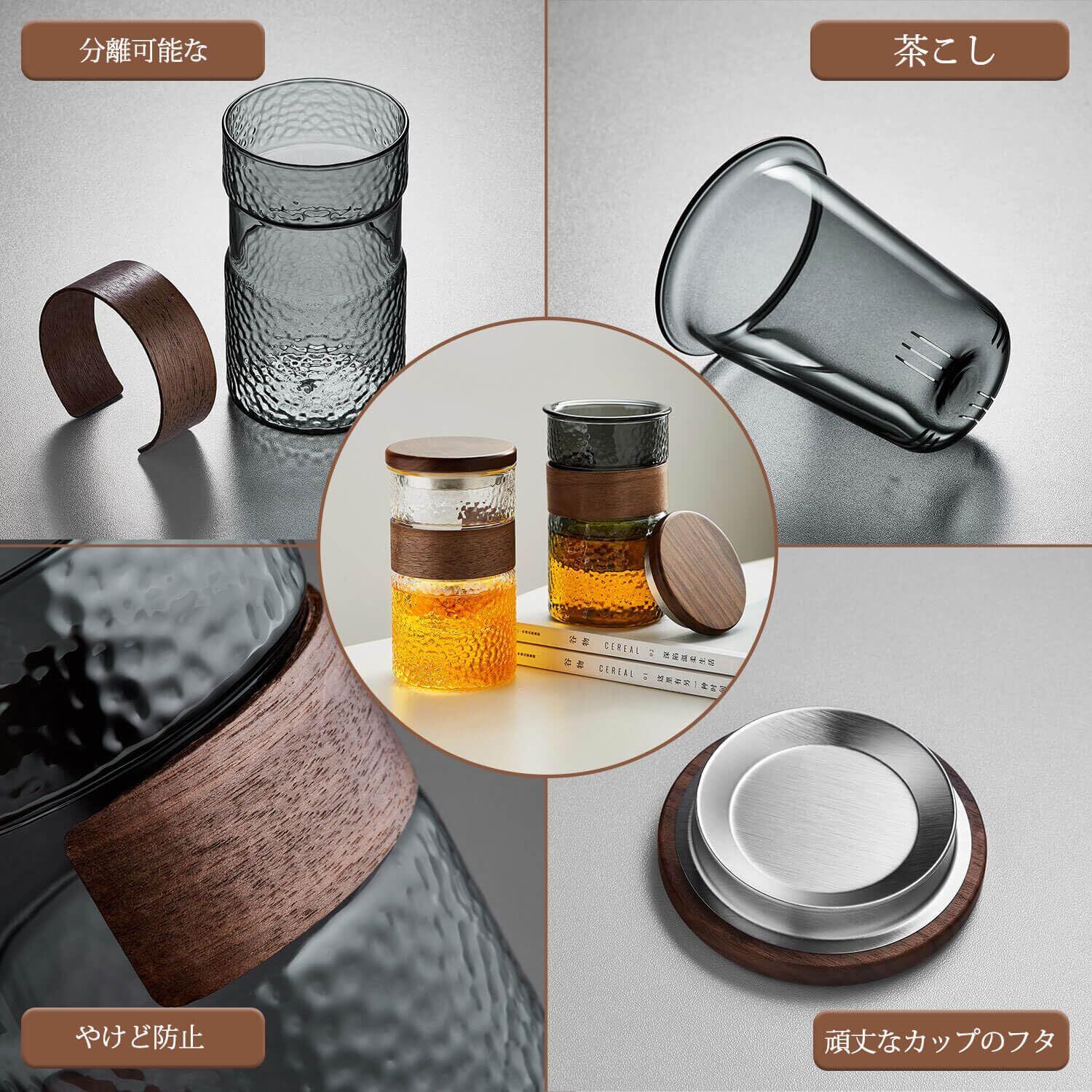【木製フタ&ホルダー付き】 – 天然木のフタとホルダーが手に馴染み、熱を和らげるため持ちやすく安全。おしゃれなデザインでインテリアとしても映えます。