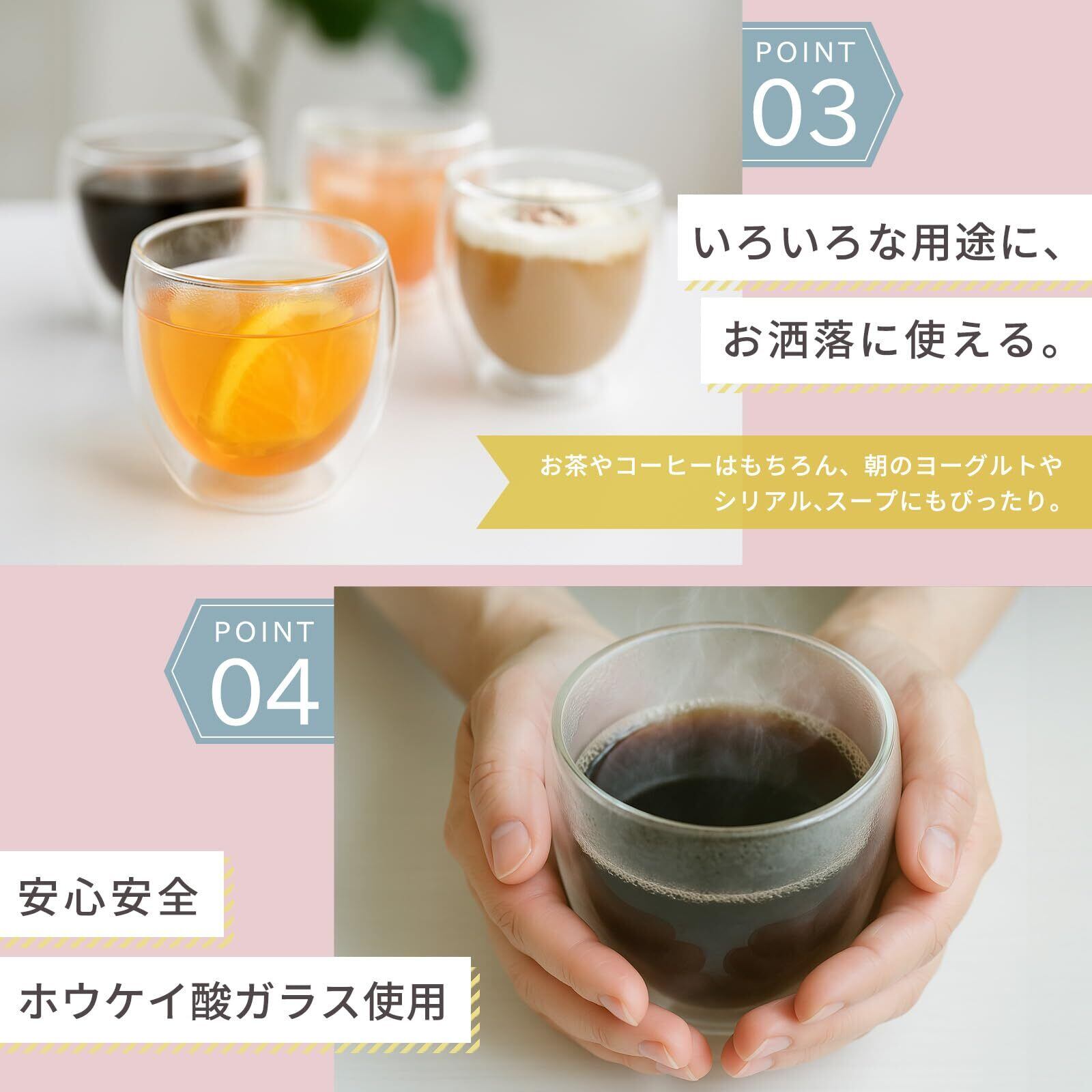 【二重構造で見た目も機能も◎なダブルウォールグラス】 断熱性に優れた二重構造のダブルウォールグラス。ホットでもアイスでも温度を保ちやすく、持っても熱くなりにくい設計です。見た目もおしゃれで、コーヒーや紅茶などのドリンクを美しく引き立ててくれます。ペアで揃えて、家族やカップルでの使用にもぴったりです。