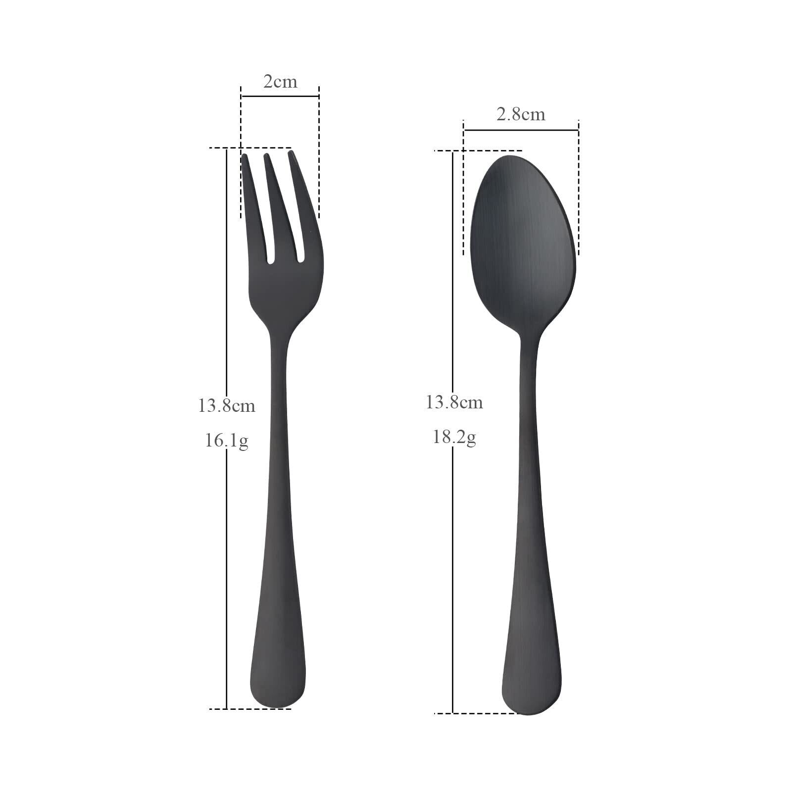 『セット内容』:ティースプーン 4本+デザートフォーク 4本 サイズ:スプーン長さ13.8㎝×幅2.8㎝ 重さ18g フォーク長さ13.8㎝×幅2㎝ 重さ16g