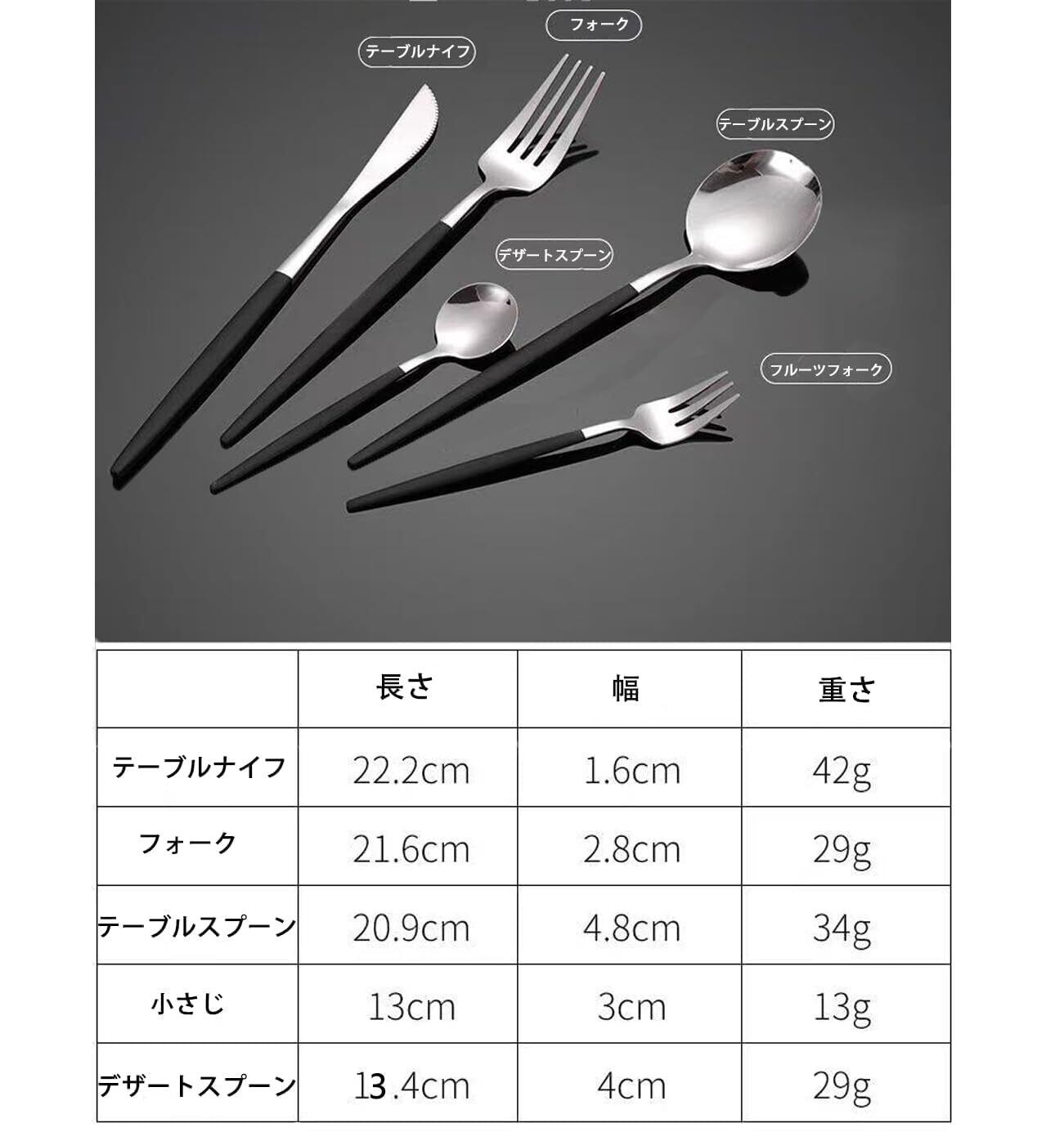 【カトラリー商品仕様】素材:304ステンレス 商品サイズ/重さ:(約)ステーキナイフ:23cm、ディナーフォーク:21cm、ディナースプーン:20cm、デザートスプーン:13cm 6xテーブルナイフ、6xテーブルフォーク、6xテーブルスプーン、6xテーブルティースプーン 6人のほとんどの家族のニーズにも対応できます。レストランはユニークなスタイルで、キッチン、ホテル、レストランに最適です。仕様:食洗機対応可。上質なステンレスを採用し、高級感があり、テーブルに並んでるだけで食卓が華やかになり、いつもの料理が3割増しで美味しく感じられます。おしゃれなカトラリーセット!