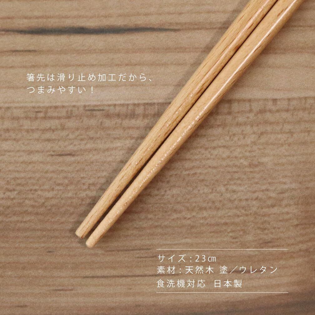 【素材と加工】このお箸は、天然木を使用して作られており、素材の持つ温かみと自然な風合いを楽しめます。箸先には滑り止め加工が施されており、食材をしっかりとつかむことができます。毎日の食事がより快適に感じられるデザインです。