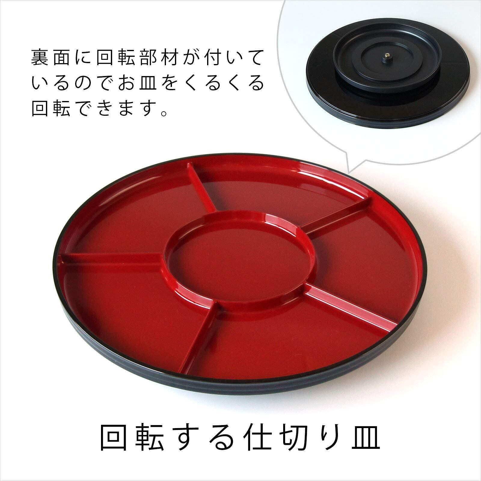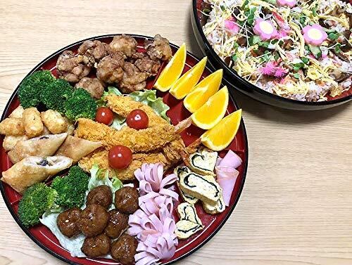 家族団らんでの食事やパーティー用に。 お家での食事を楽しくする回転オードブル皿、多用鉢、しゃもじ3本がセットになった赤黒の合成漆器の手巻き寿司セットです。