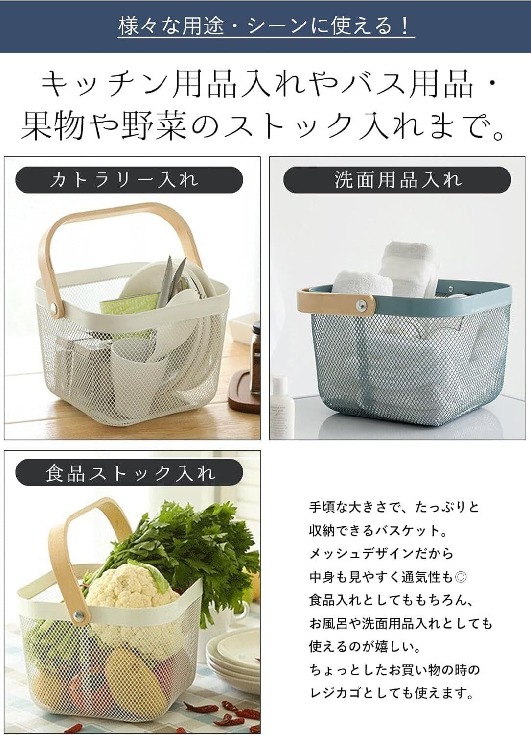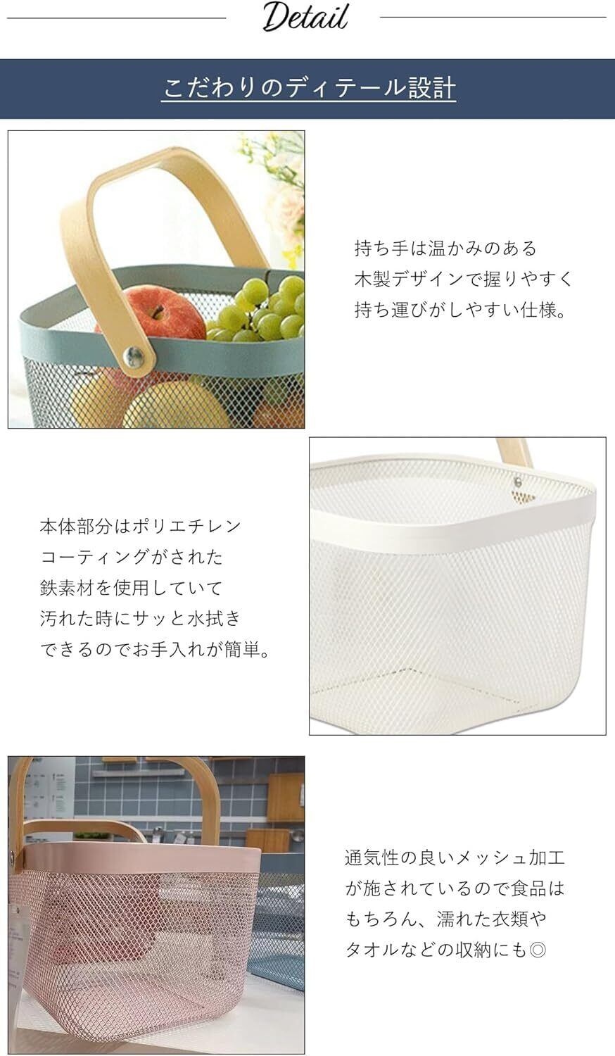 【使い勝手抜群】どんな人でも使いやすい収納バスケット。手頃な大きさでたっぷりと収納できるバスケット。メッシュデザインだから中身も見やすいのがうれしい!ちょっとしたお買い物のときのレジカゴとしても大活躍。