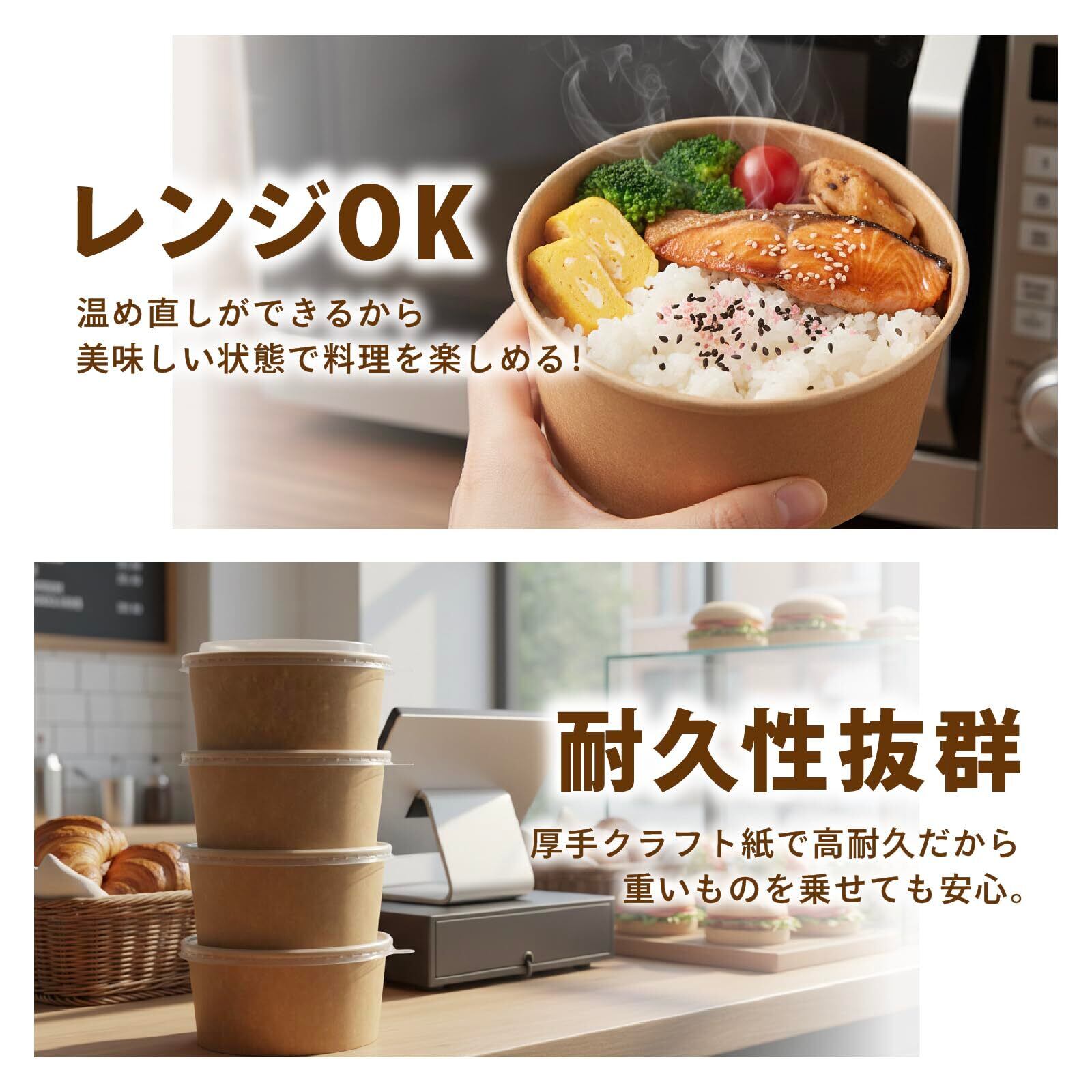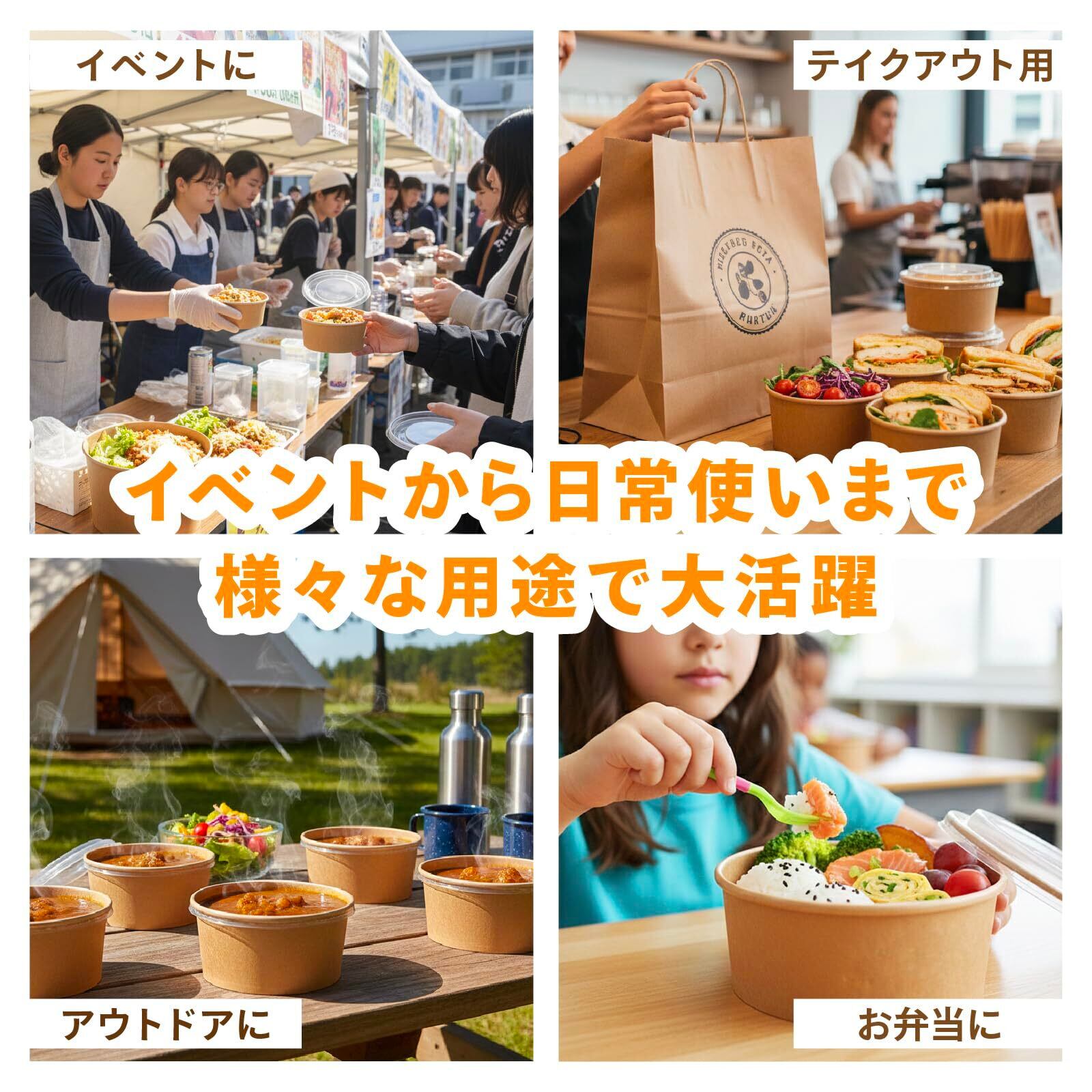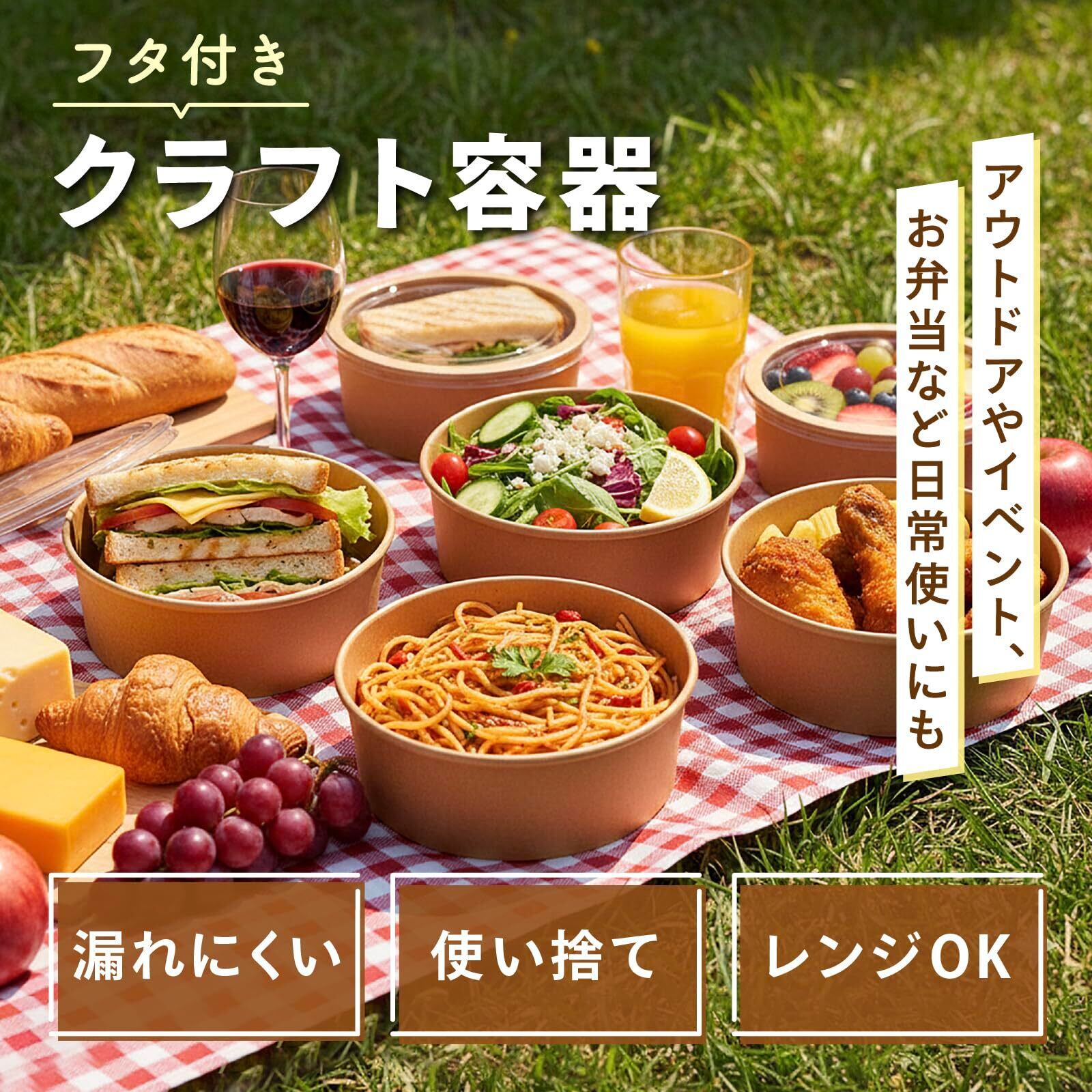 【しっかり閉まる蓋付きで持ち運びにも便利】 付属の蓋は本体にフィットしやすい設計で、料理を入れた後もしっかり閉められます。持ち運びやおすそ分けの際にも使いやすく、イベントや屋外での利用にも便利。シンプルなクラフトデザインなので、カフェ風のテイクアウト容器としても自然に馴染みます。家庭用だけでなく、学園祭やフードイベントなどにもおすすめです。