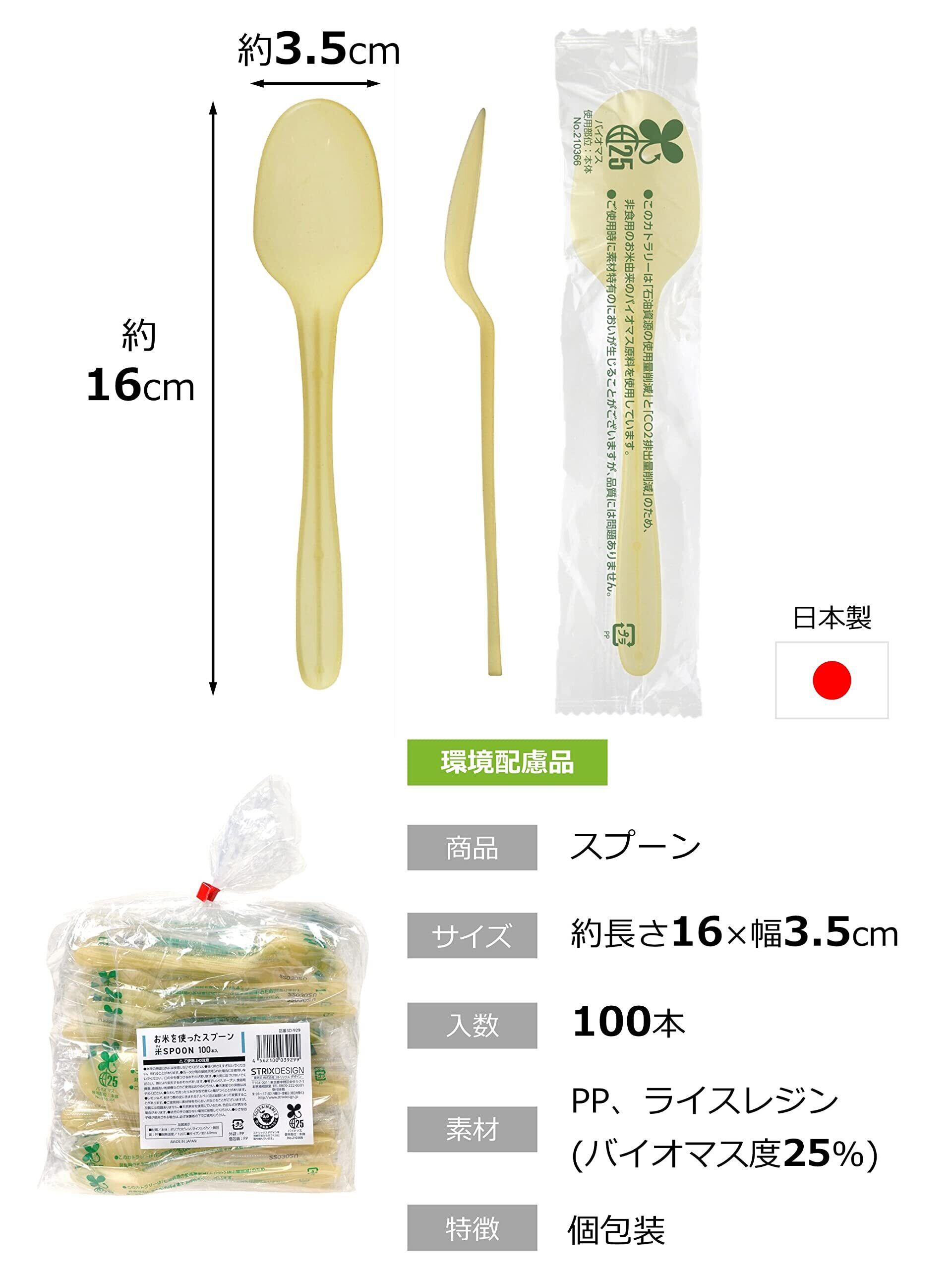 ストリックスデザイン 使い捨てスプーン バイオマス 日本製 100本 16cm ナチュラル お米を使った スプーン 個包装 環境配慮 業務用 SD-929