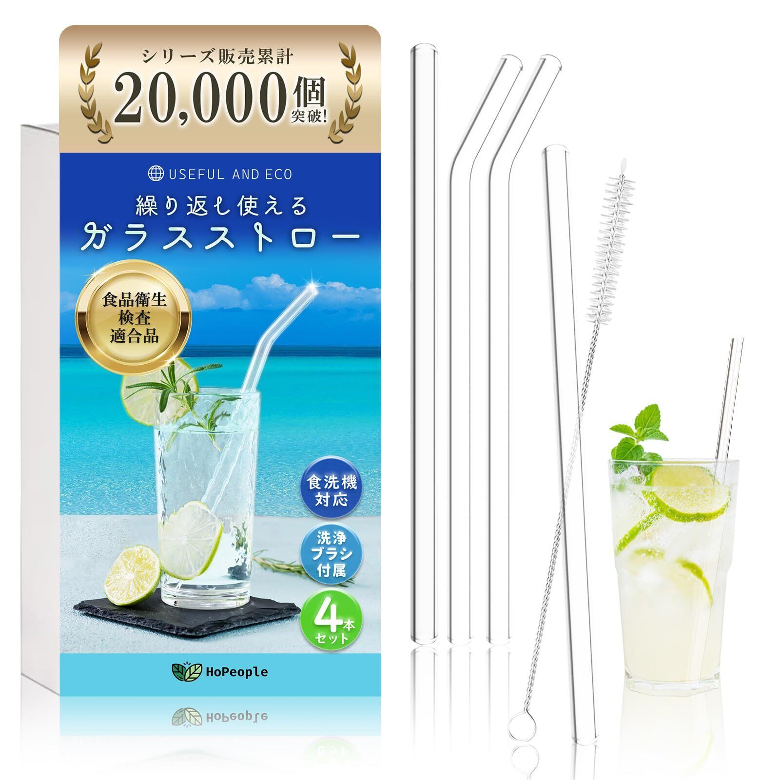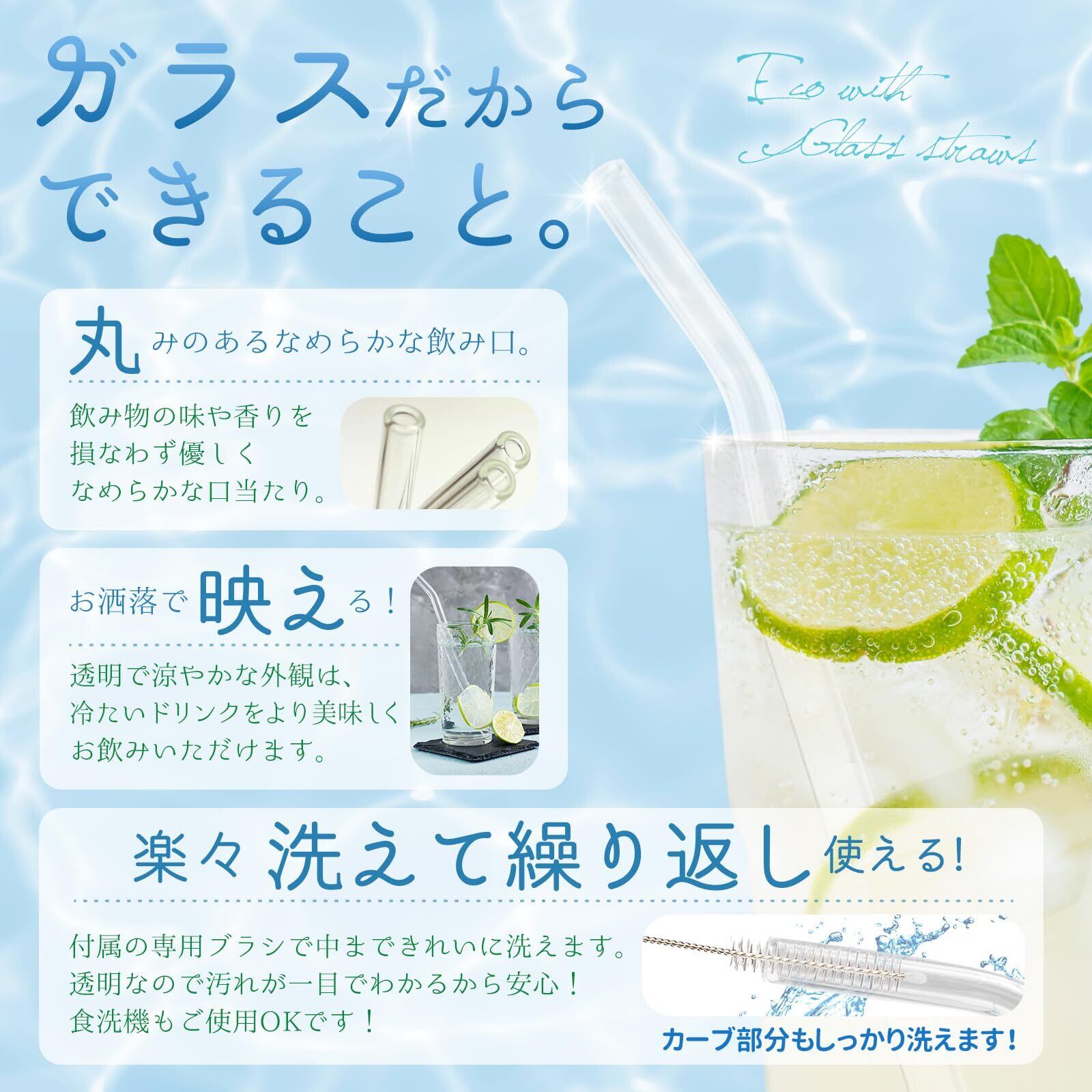 ガラスストロー 4本セット。ストレートタイプ2本&ベント(曲がった)タイプ2本&専用ブラシ1本付き 食品衛生法 適合で安心安全の製品です。