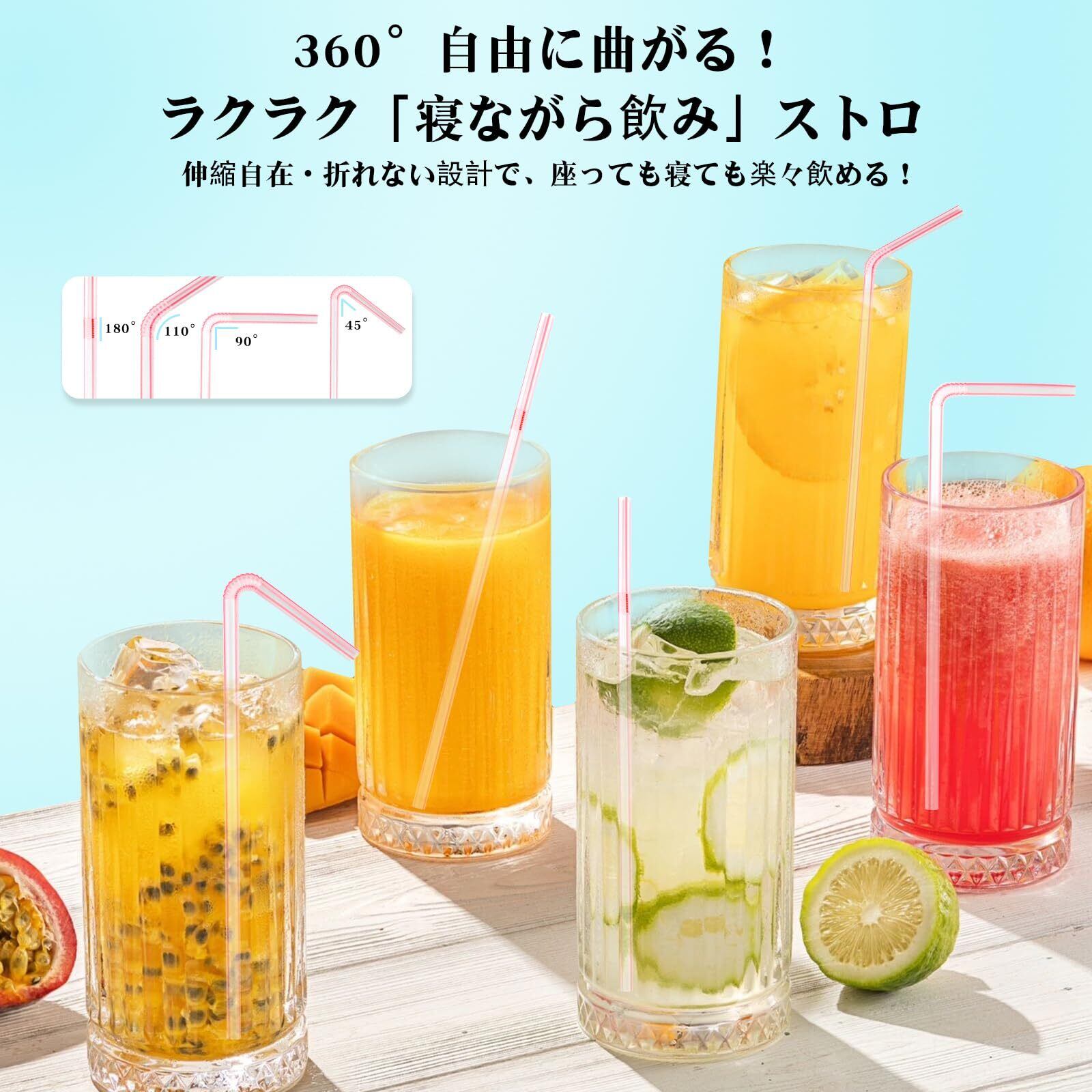 【360°自由曲げ&寝ながら飲める設計|介護・車内に最適】 直径5mm×長さ23cmの曲がるストロー200本入!180°・90°・45°あらゆる角度で固定可能。ベッドでの「寝飲み」や車内・介護シーンに最適。介護用ベッドや車椅子での利用に便利な柔軟性を実現。
