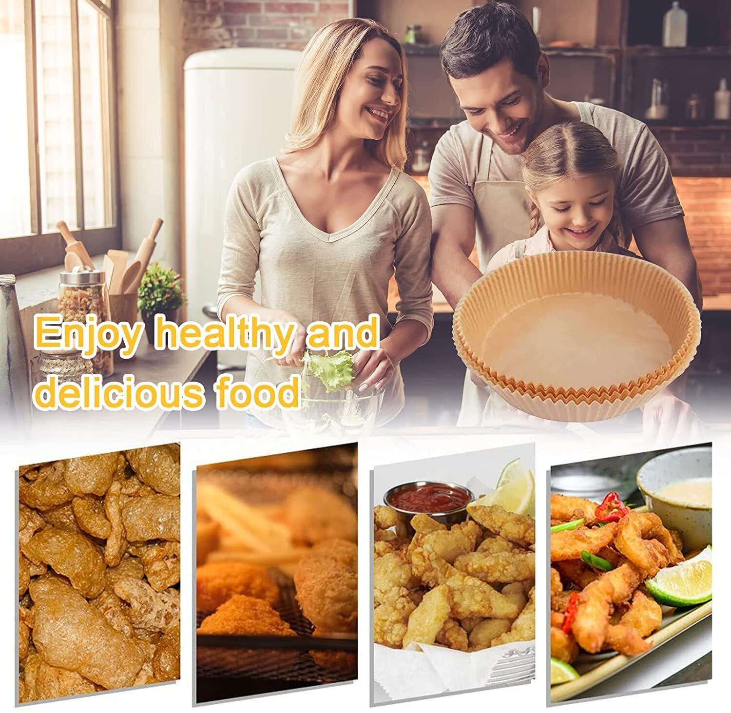 エアフライヤー用パーチメント紙サイズ】:底部直径16cm*高さ4.5cm 無漂白。使い捨て紙マットは丸いボウル型で、曲げたりする必要がなく、調理時にそのまま置くことができます。4.5cm高さの縁がエアフライヤーの側面を保護し、食べ物がつかするのを防ぎます。