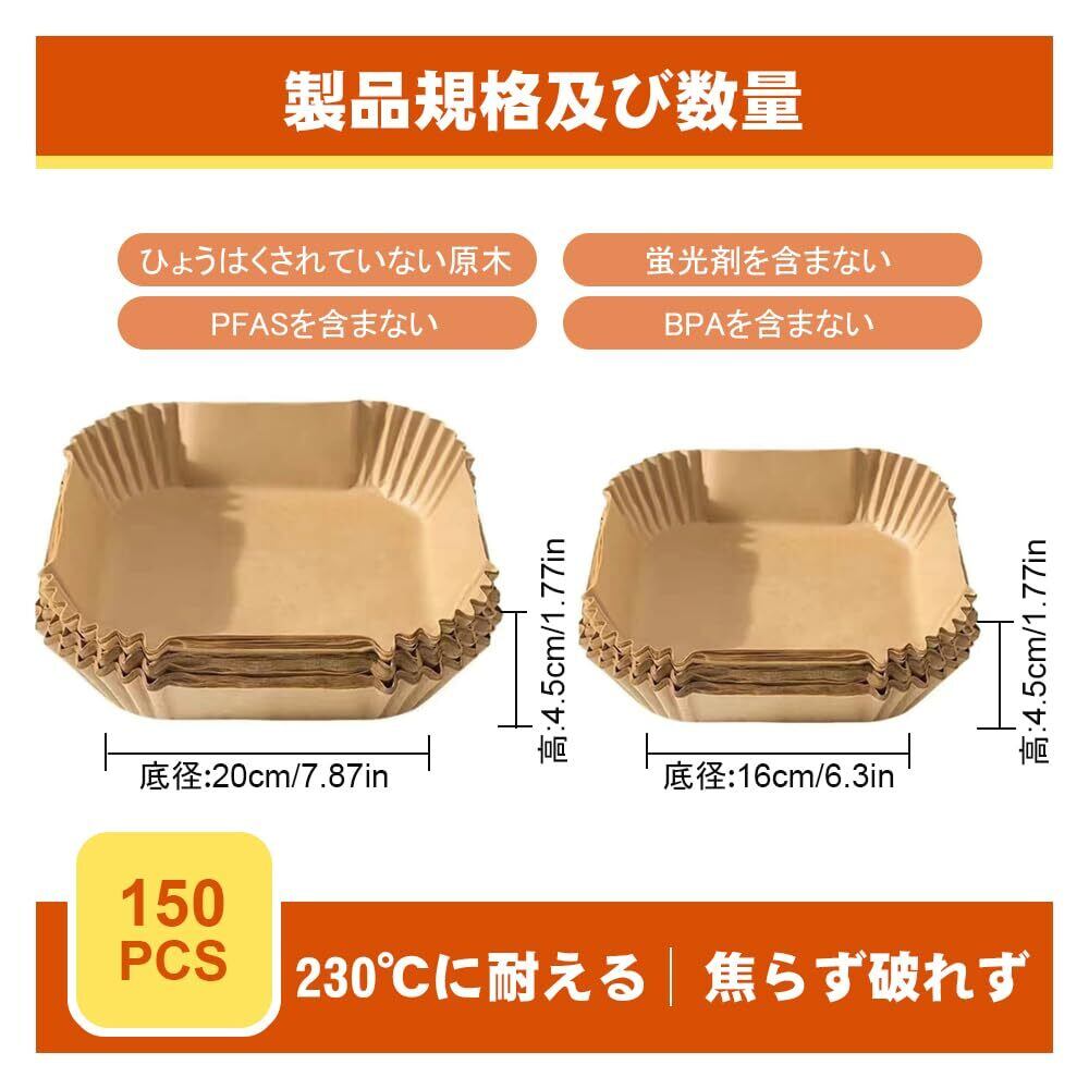 150枚 ノンフライヤー 使い捨て紙 エアフライヤー用紙 天ぷら敷紙 四角形 内径16cm 耐熱性 3-8L適用 使い捨て 耐油紙 耐水性 対応エアフライヤー 電子レンジ オーブン 蒸し器 クッキングペーパー 蒸し器
