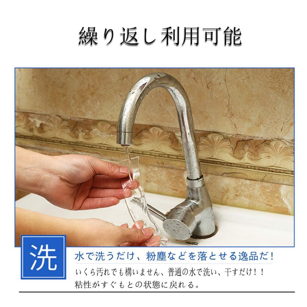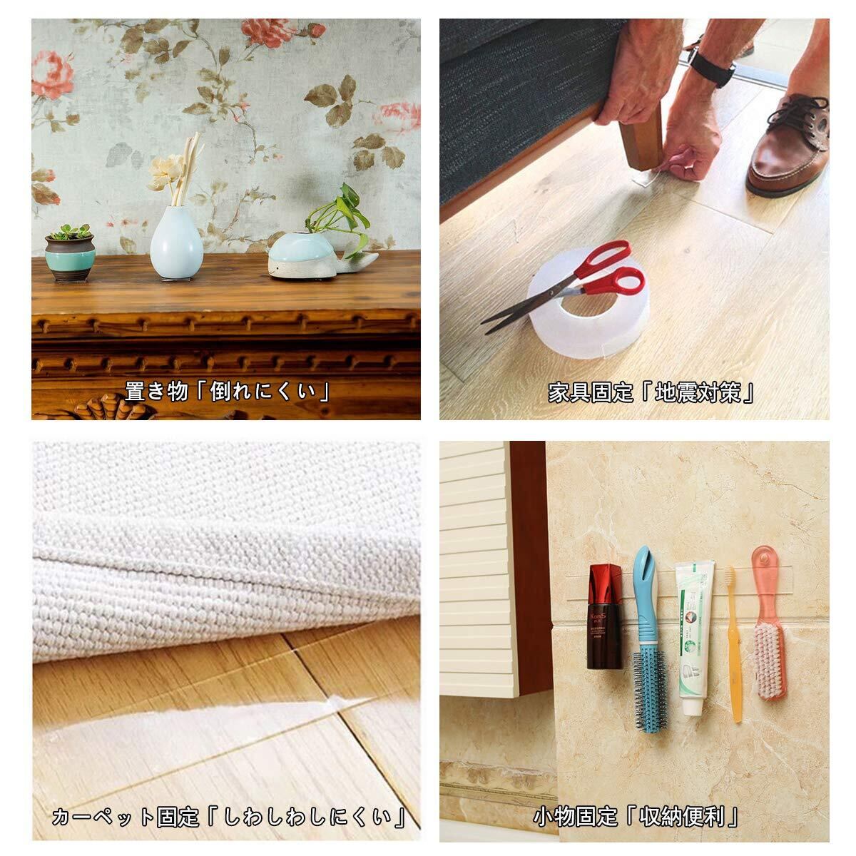 【水で繰り返し&多機能で活躍】更にこのテープは水で粘着性を回復できます!水で粉塵などを洗い落とし、テープを干してから、またもとのテープに戻れます。色んなシーンで大活躍します。日常の家の玄関や台所、客室、洗面所から、オフィス、寮、家電製品の足固定「地震対策」、コマーシャル看板の固定、カーペットの滑り止め、小物収納や置物固定などにご利用いただけます。