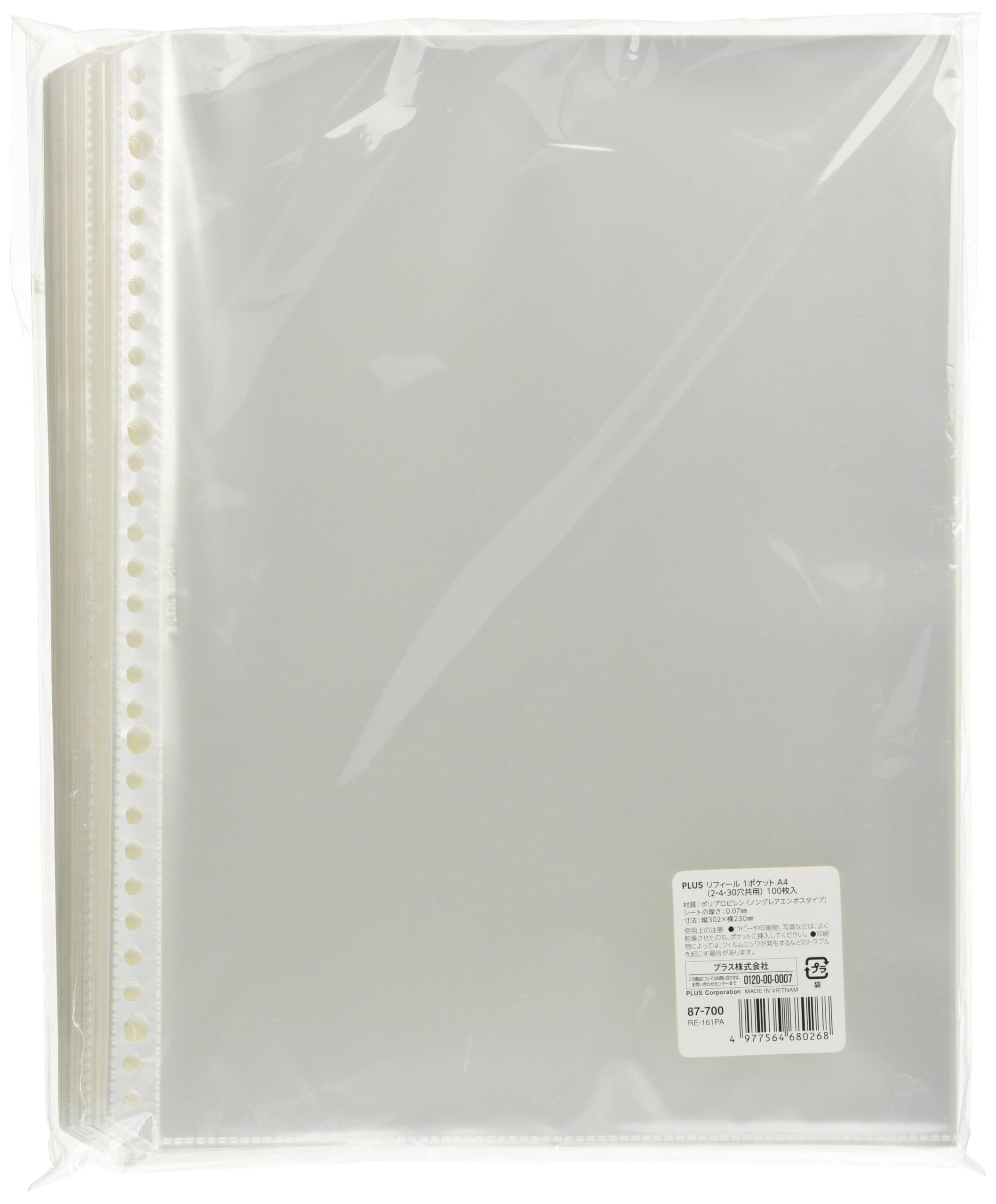 プラス リフィル ポケットリフィール A4 1ポケット 100枚 2穴 / 4穴 / 30穴共用 87-700 ポリプロピレン (PP) 透明