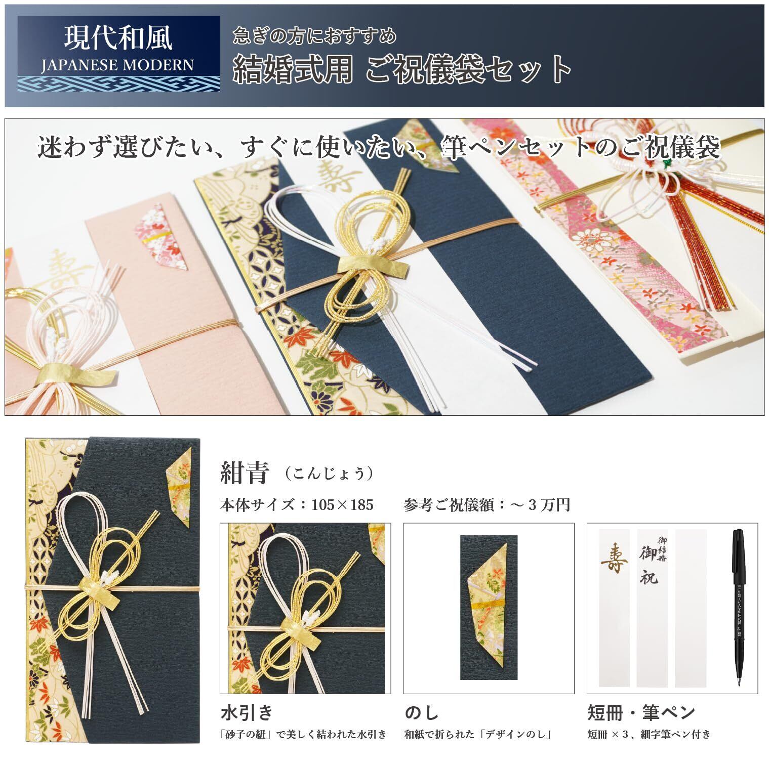 【特価セール】すぐに使える 筆ペン付きご祝儀袋 和モダン ご祝儀袋 結婚式 のし袋 水引 内袋 短冊 筆ペン |~3万円用 紺青(こんじょう)
