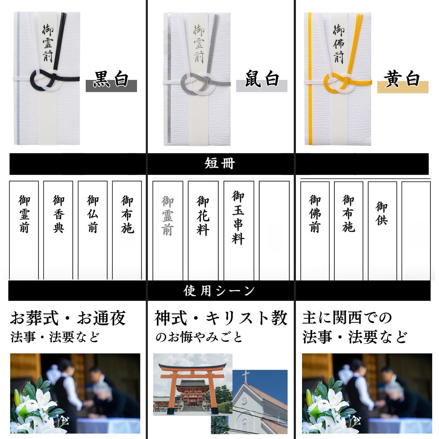 (使用シーン)仏式のお通夜、お葬式、法要、神道、無宗教 (金額目安)5千円~5万円