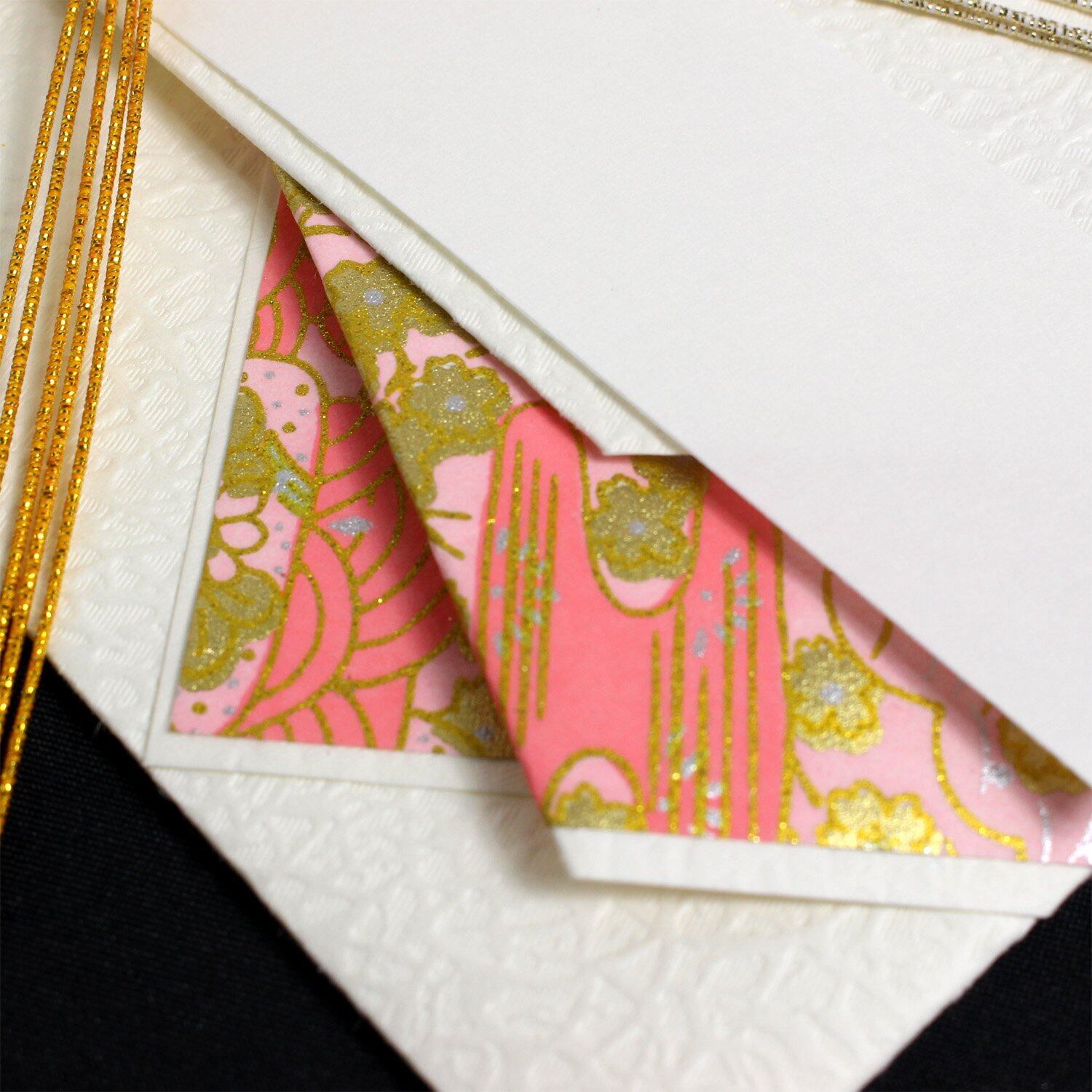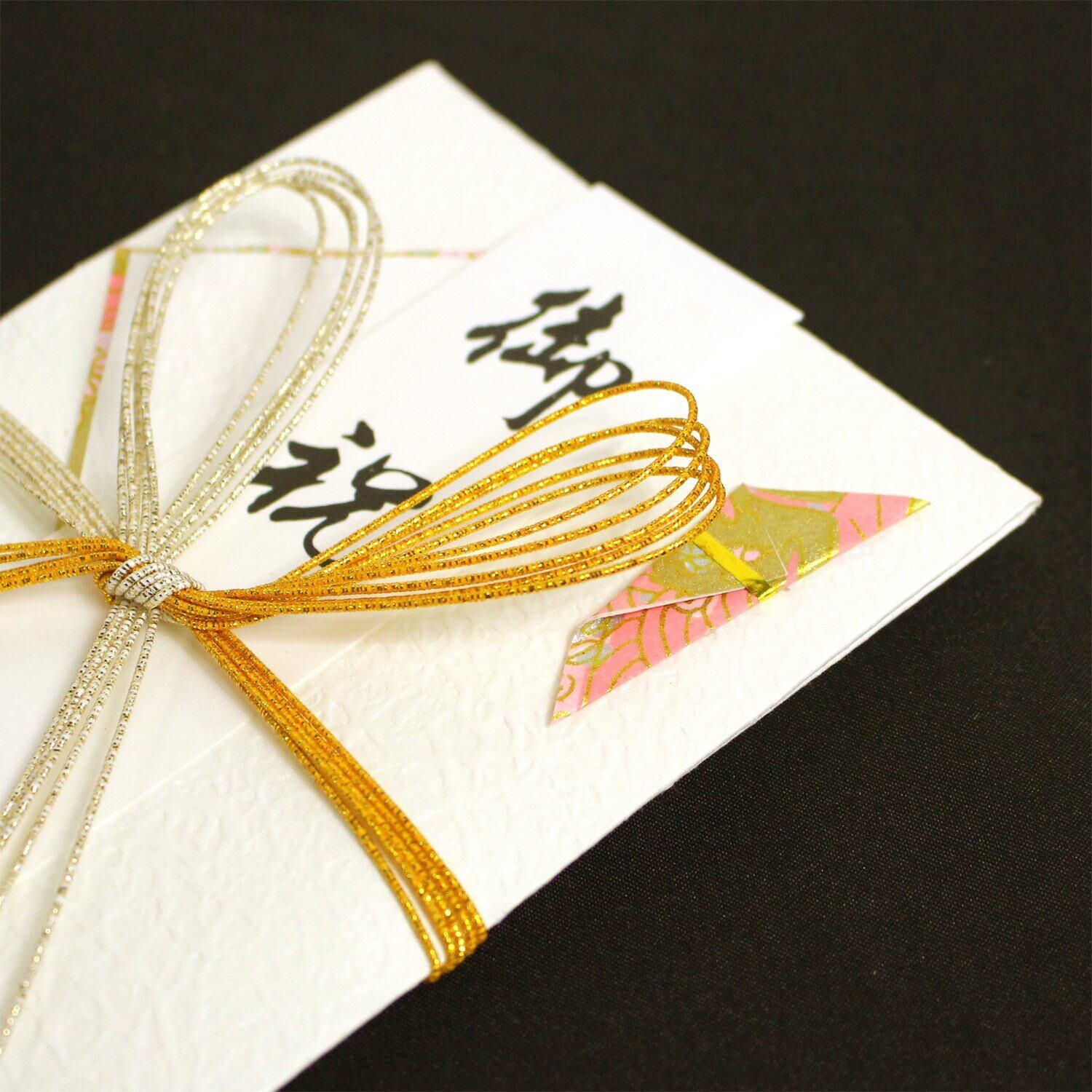 婚礼以外のお祝全般用金封。水引を外さないでお金を入れる事ができます。短冊4枚入:御祝、御出産お祝、御新築御祝、白無地。メッセージカード付。本折中包み付