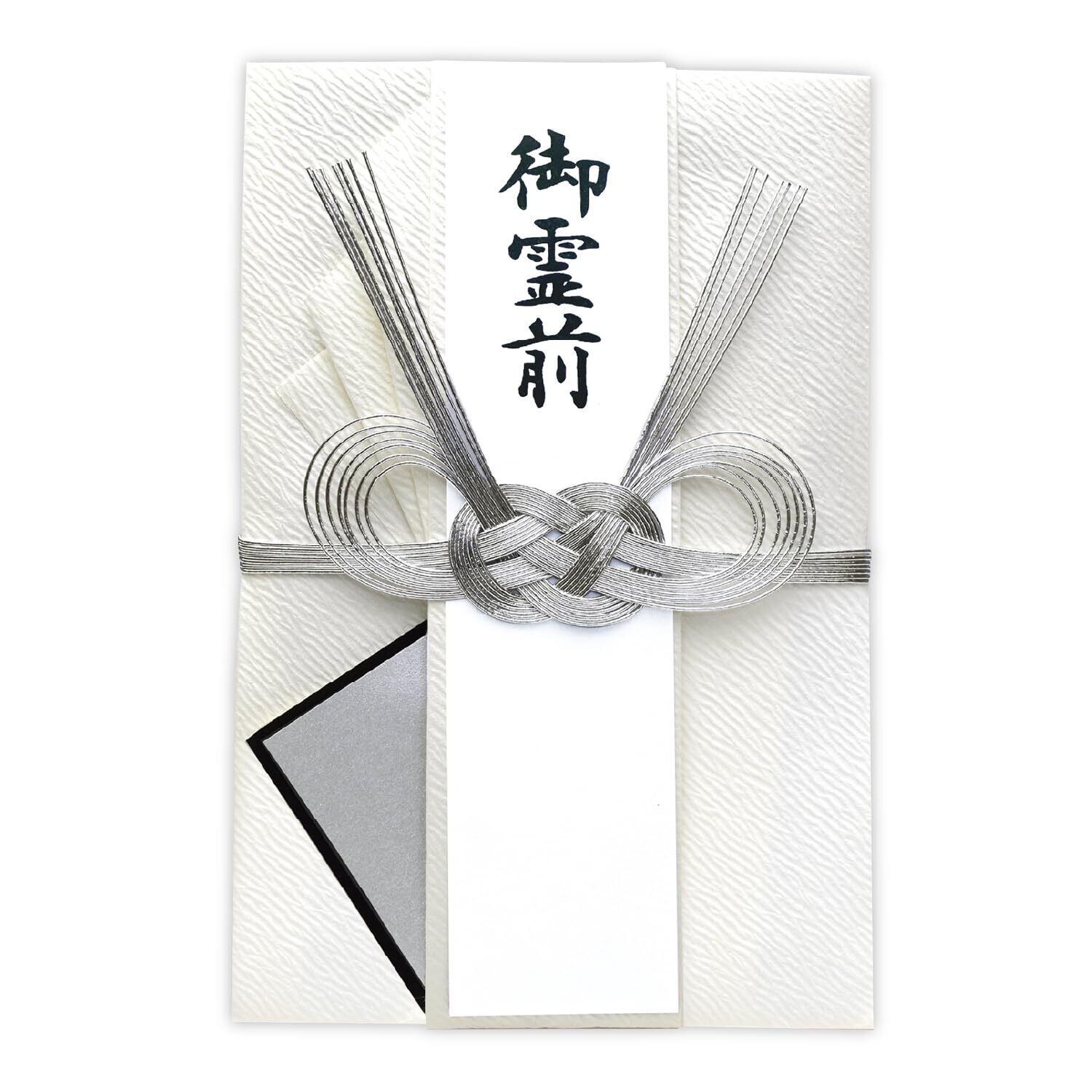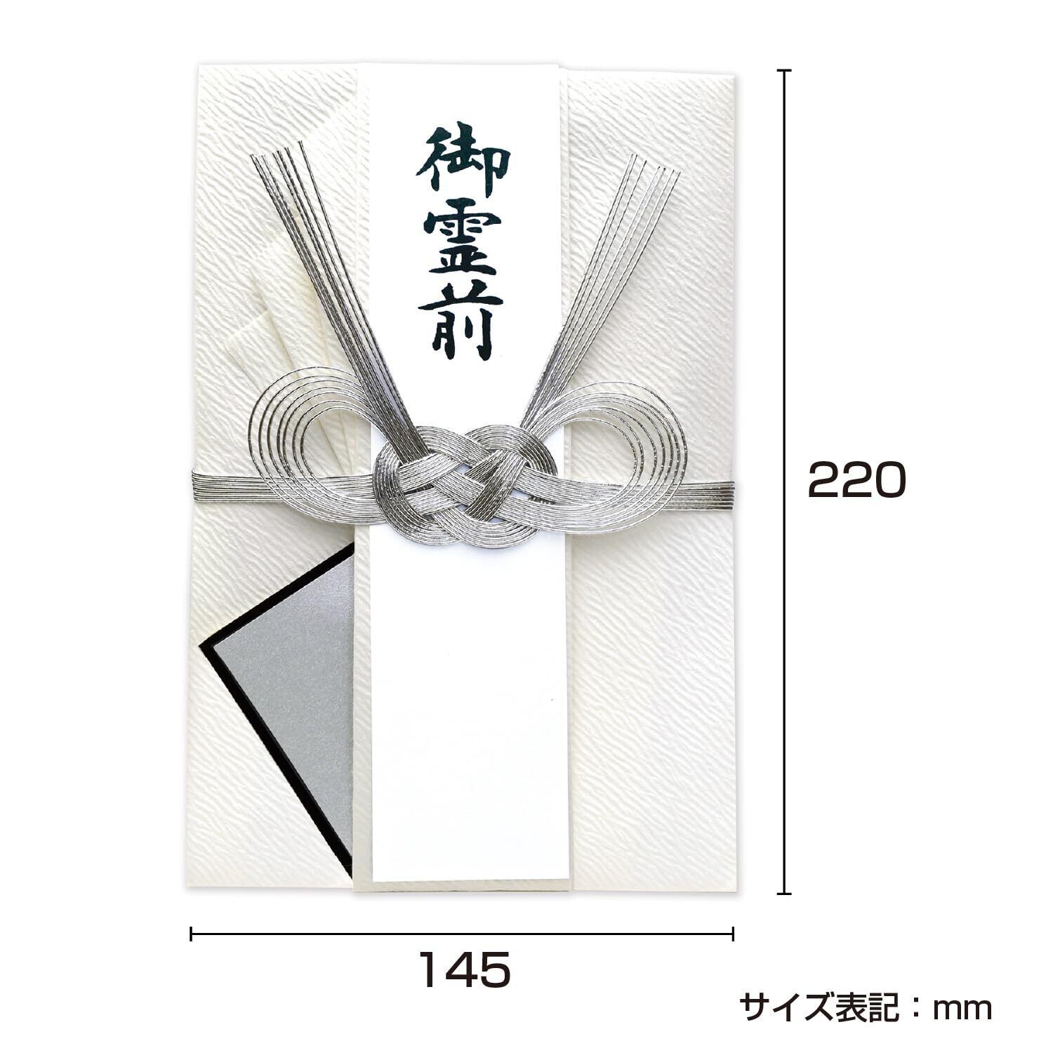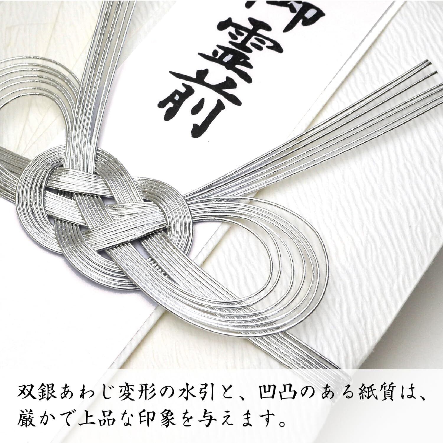 仏事用の金封。紙幣一万円札で100万円まで。双銀あわじ変形の水引と、凹凸のある紙質は、厳かで上品なデザイン。手書き専用の短冊とは別に、プリンター対応短冊がセットになっているので無料テンプレートを使用し簡単に印刷して制作可能。葬儀や法事に最適。包む金額の目安は30〜100万円。短冊(御霊前/御佛前/御香奠)、中袋付き。
