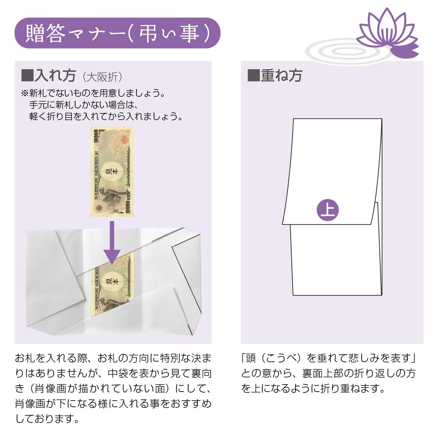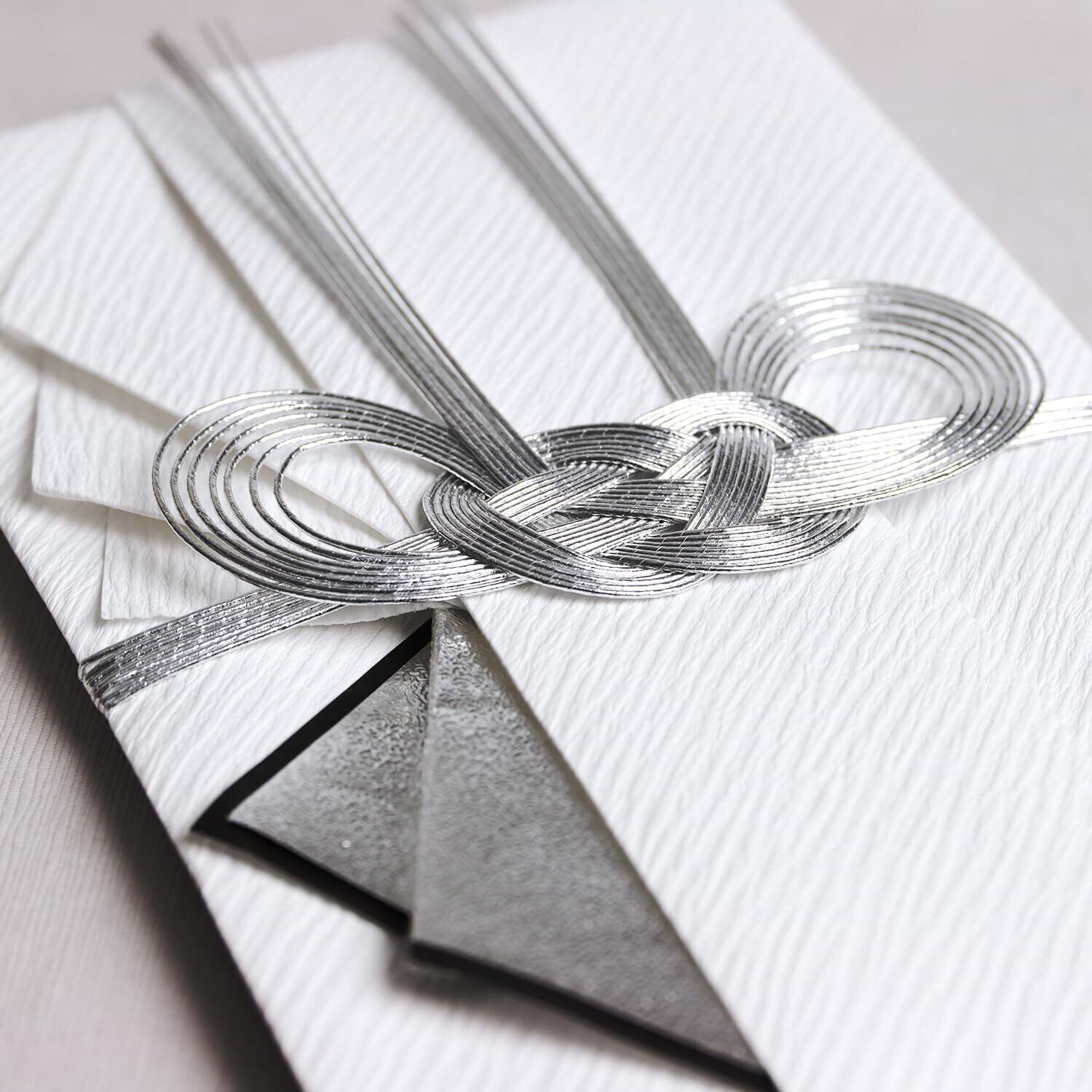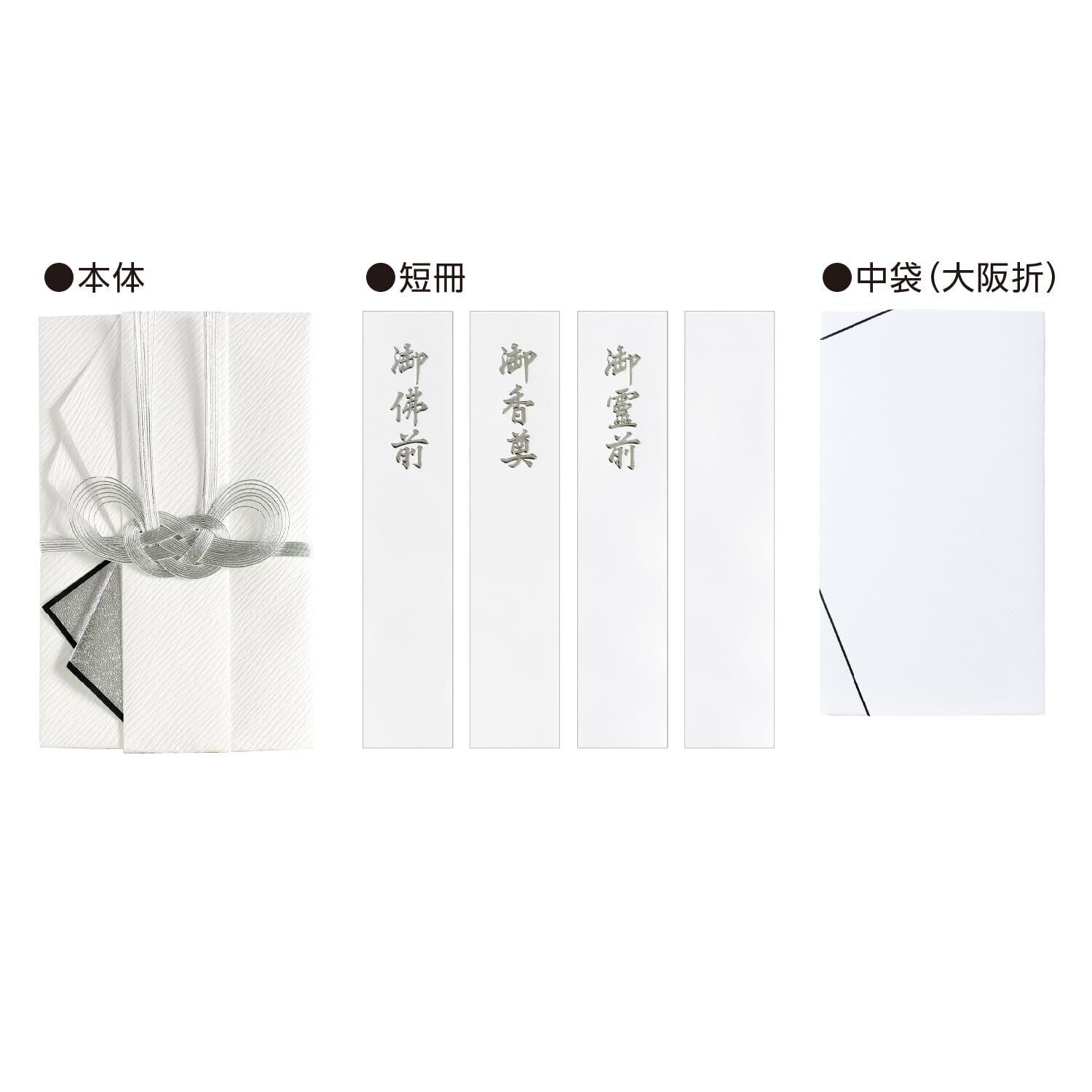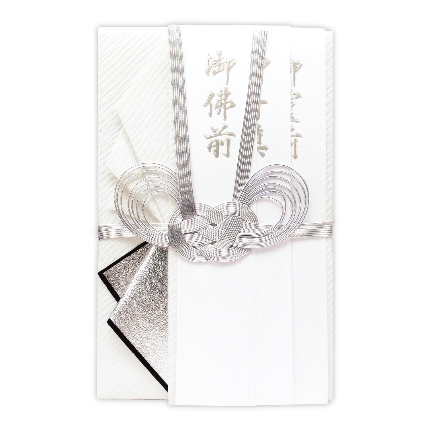仏事用の金封。繊細な双銀の水引細工をほどこした大判サイズの本格派ひだ折金封。本体は和紙を使用し、扇状に折り込みひだをあしらったデザイン。葬儀や法事に最適。包む金額の目安は10万円以上。銀箔の文字が印刷がされた短冊、中袋付き。
