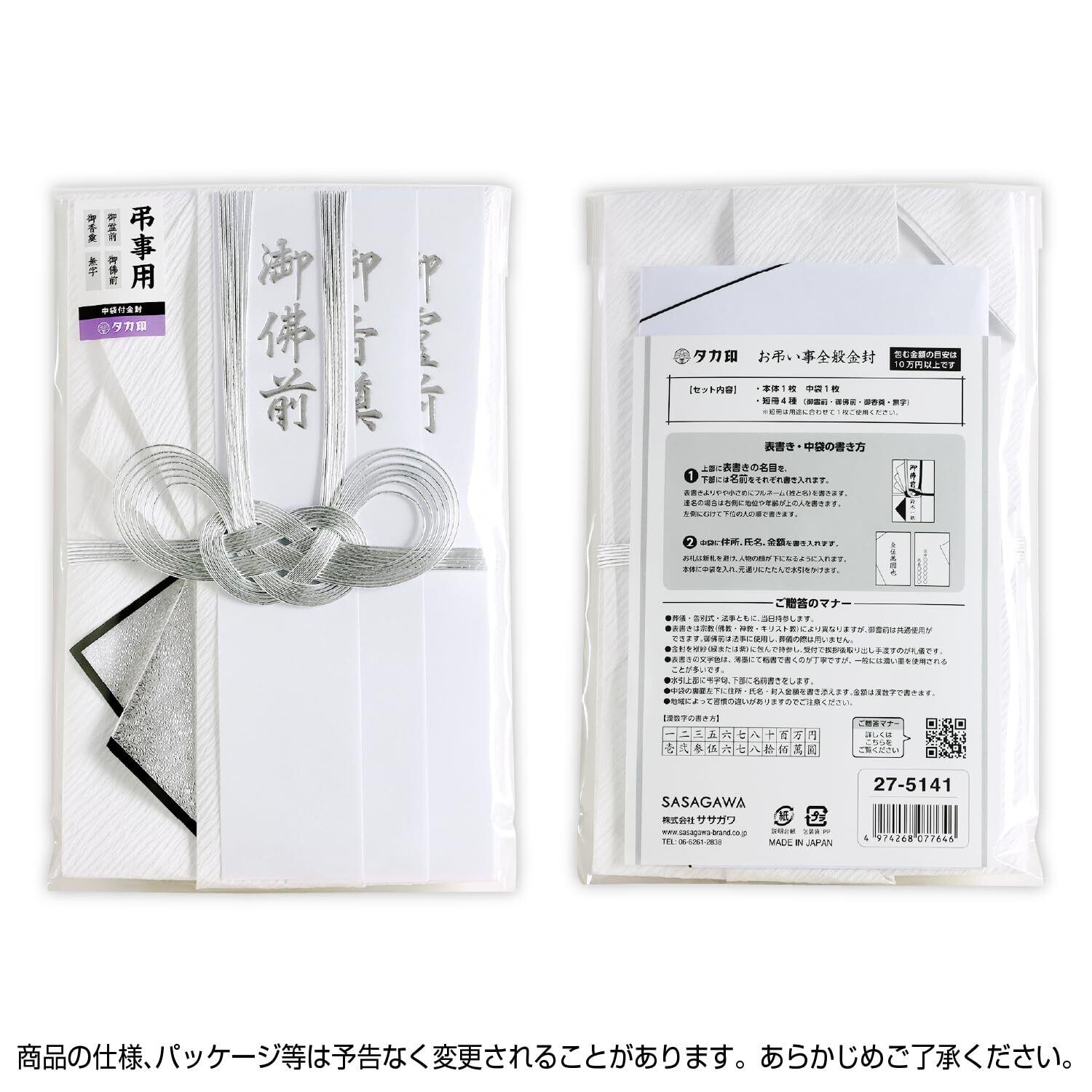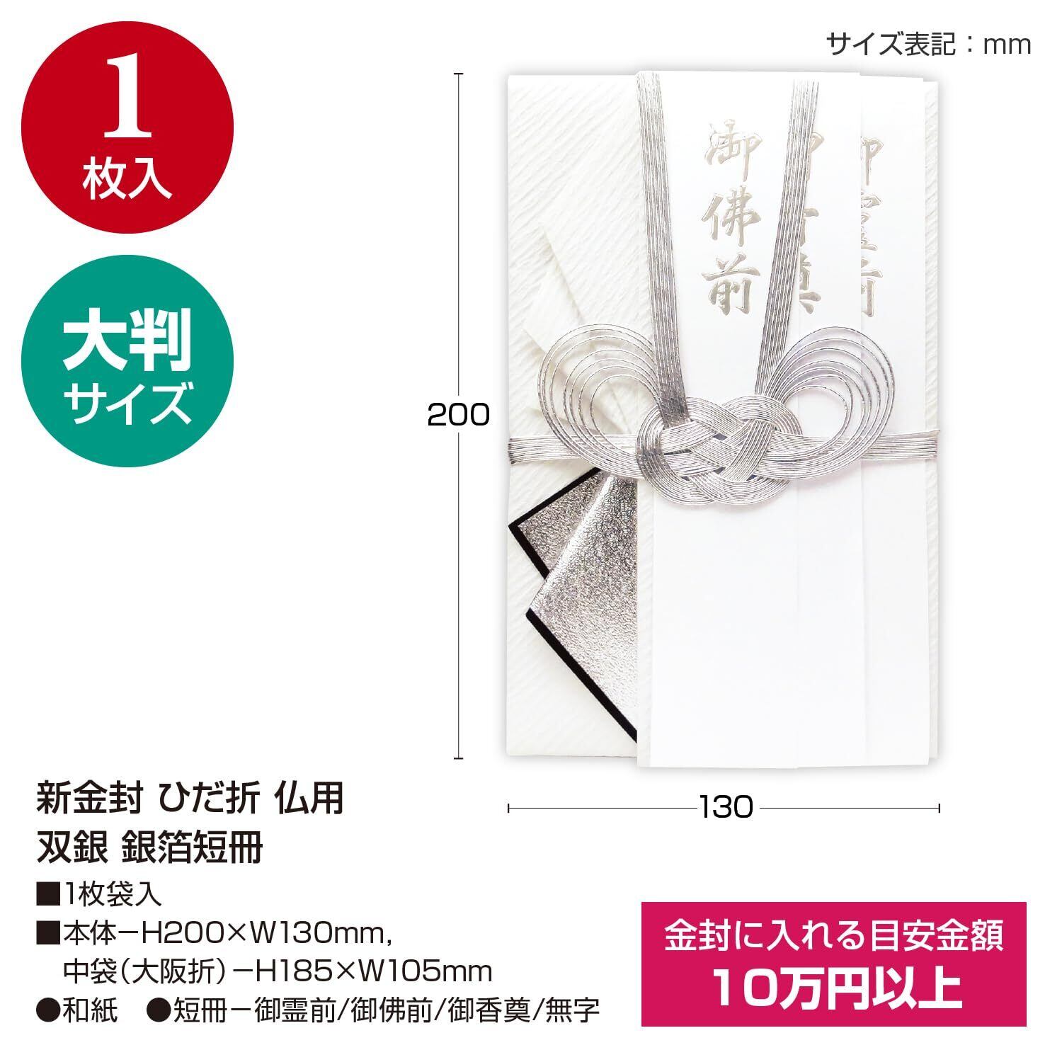 ササガワ 祝儀袋 不祝儀 タカ印 仏用 大判サイズ 金封 ひだ折 双銀 銀箔短冊 御霊前 御佛前 御香奠 無字 1枚 27-5141