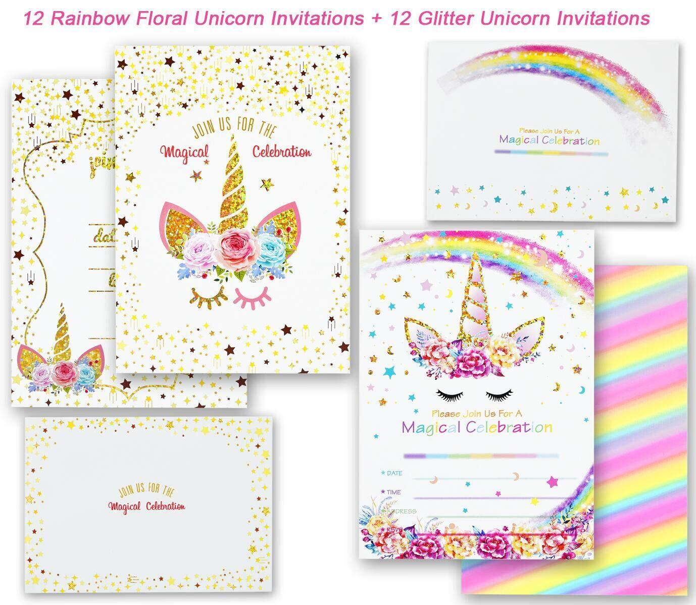 ユニコーン招待状24枚(グリッターユニコーン招待状12枚、レインボーフローラルユニコーン招待状12枚)