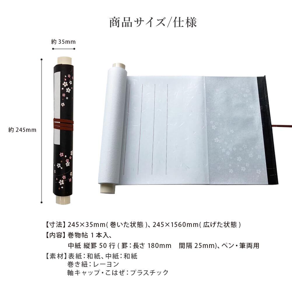 ■商品仕様 商品カテゴリ: 巻物帖 / ゲストブック / 芳名録 サイズ: 巻いた状態: 約245×35mm / 広げた状態: 約245×1560mm 素材: 表紙: 和紙、中紙: 大礼紙(和紙)、巻き紐: レーヨン、軸キャップ・こはぜ: プラスチック セット内容: 巻物帖 1本 中紙仕様: 縦罫50行(罫: 長さ180mm、間隔25mm)、ペン・筆両用