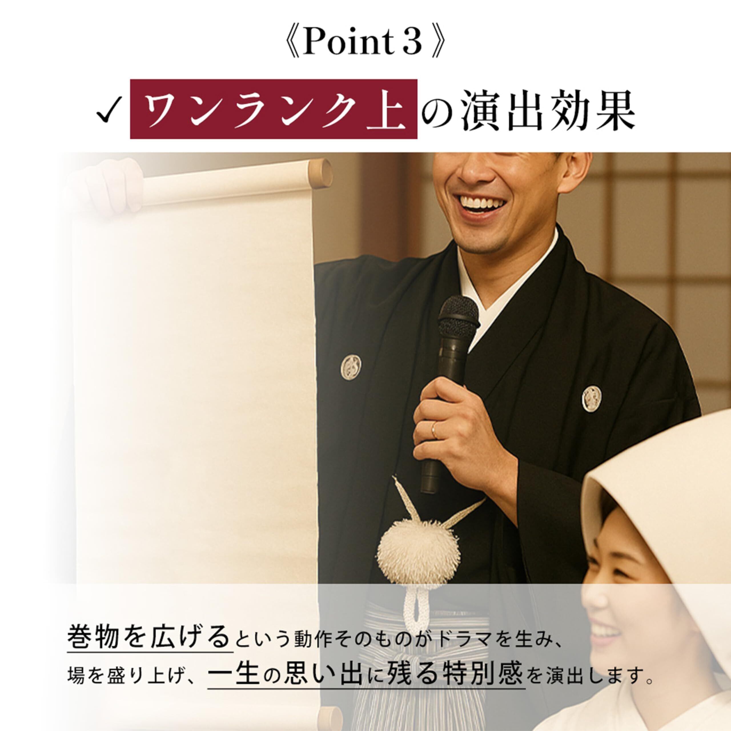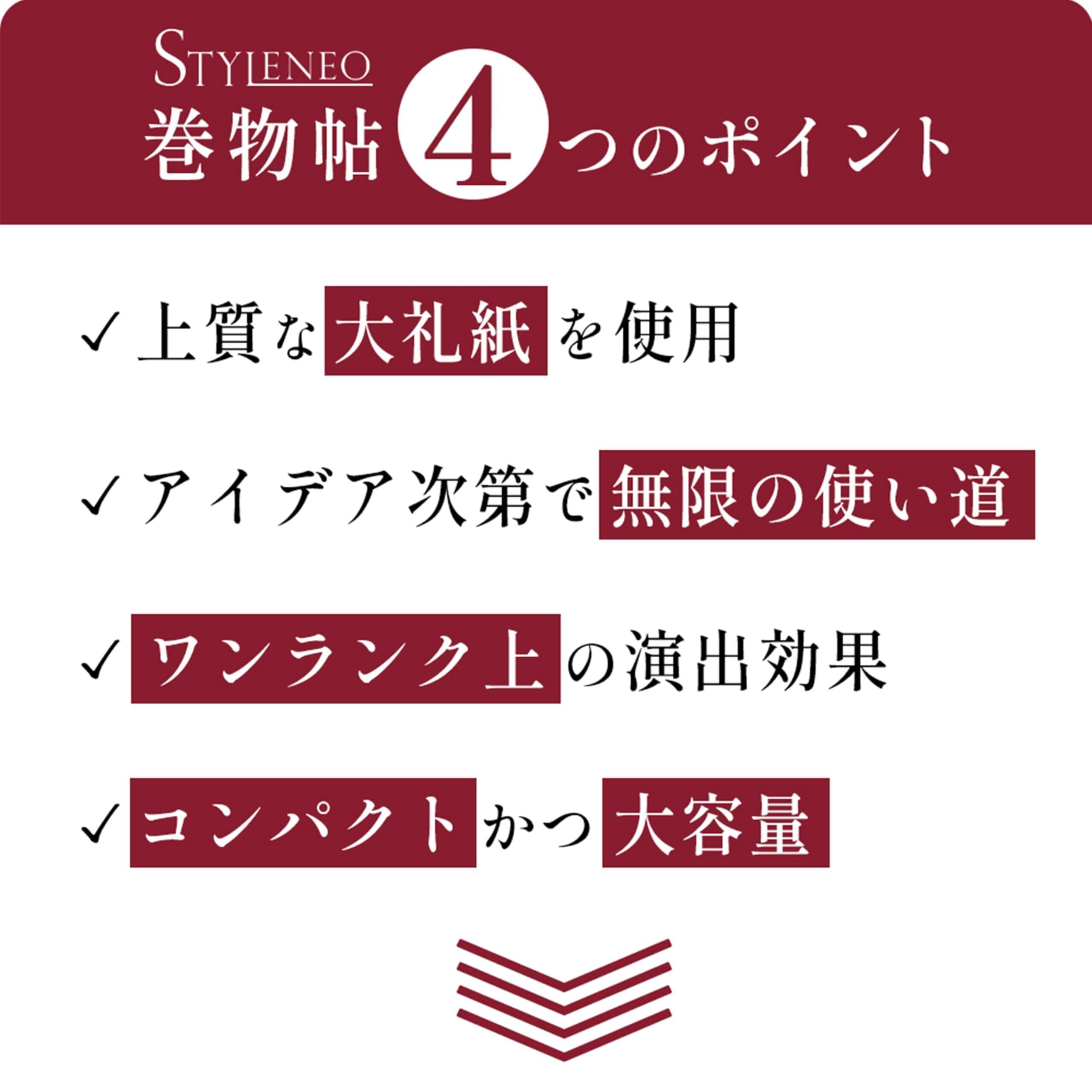 巻物帳は、伝統的な和風のデザインだけでなく、モダンな要素を取り入れたスタイルも展開されています。そのため、幅広い年齢層や好みに対応でき、どんなイベントにもマッチします。和婚をテーマにした結婚式だけでなく、モダンなウェディングやカジュアルなパーティーでも、その美しさと実用性を発揮します。 このように、巻物帳は特別な場面での使用に最適なアイテムです。美しいデザインと高い耐久性を兼ね備えた和紙の巻物帳は、一生の思い出を美しく保存するための最高の選択肢となるでしょう。大切なイベントでの使用を通じて、巻物帳が持つ伝統と美しさを感じながら、特別な瞬間を一層華やかに彩ってください。