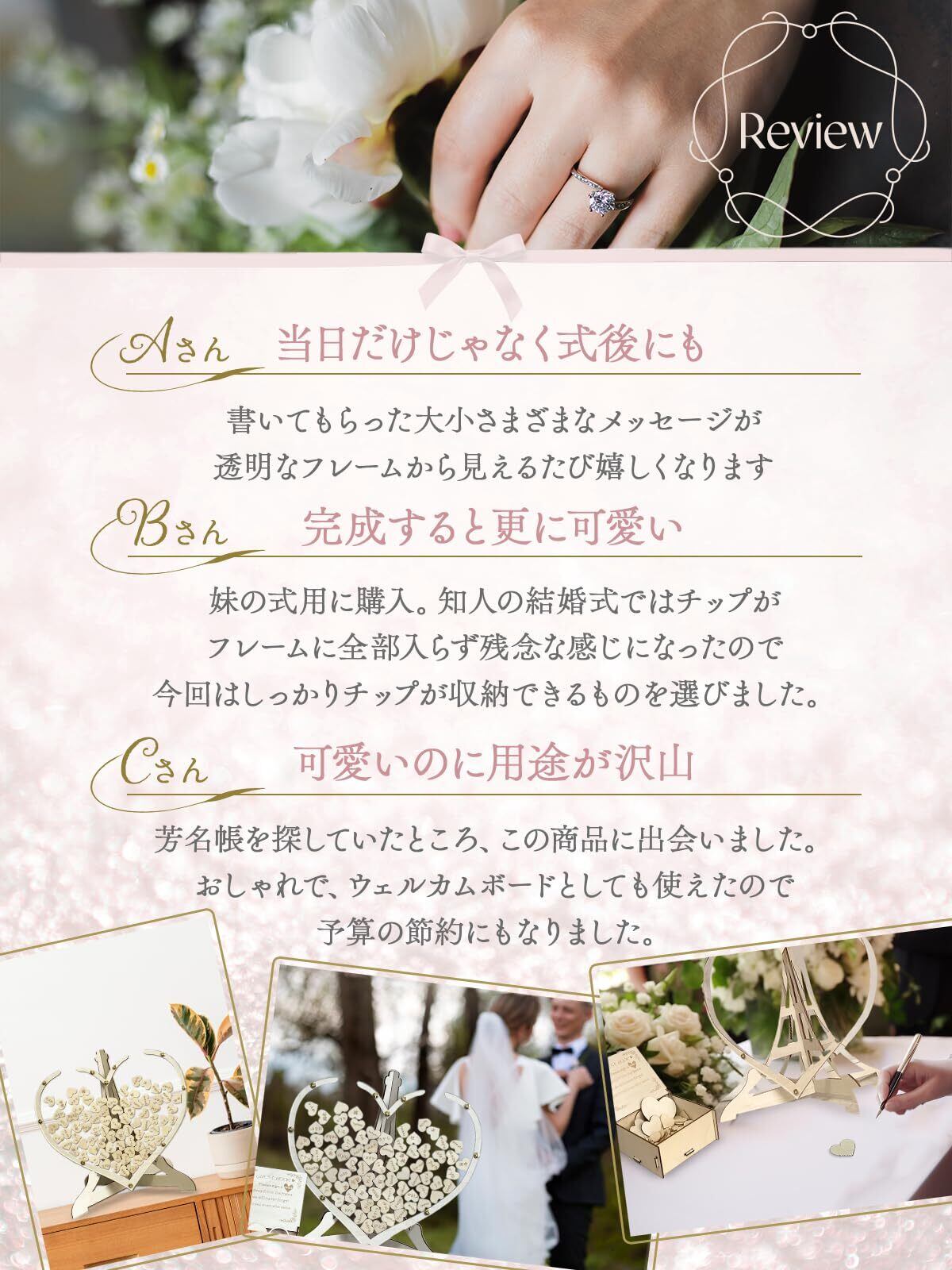 【ハート型チップ80枚収納】ハート型の木製のチップが80枚付いていて、ゲストが名前やメッセージを書き込み、フレームに入れる結婚式のゲスト参加型演出です。婚証明書やウェルカムボードとしてもお使いいただけます。