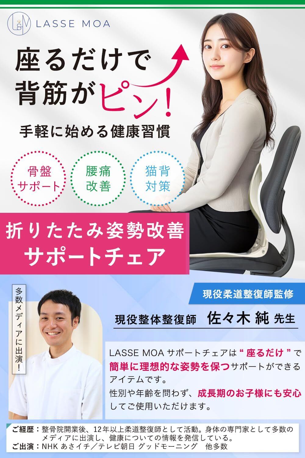 【現役の柔道整復師監修】現役整体整復師の佐々木先生に監修いただき、座るだけで簡単に理想的な姿勢を保つことができる「姿勢サポートチェア」を開発しました。