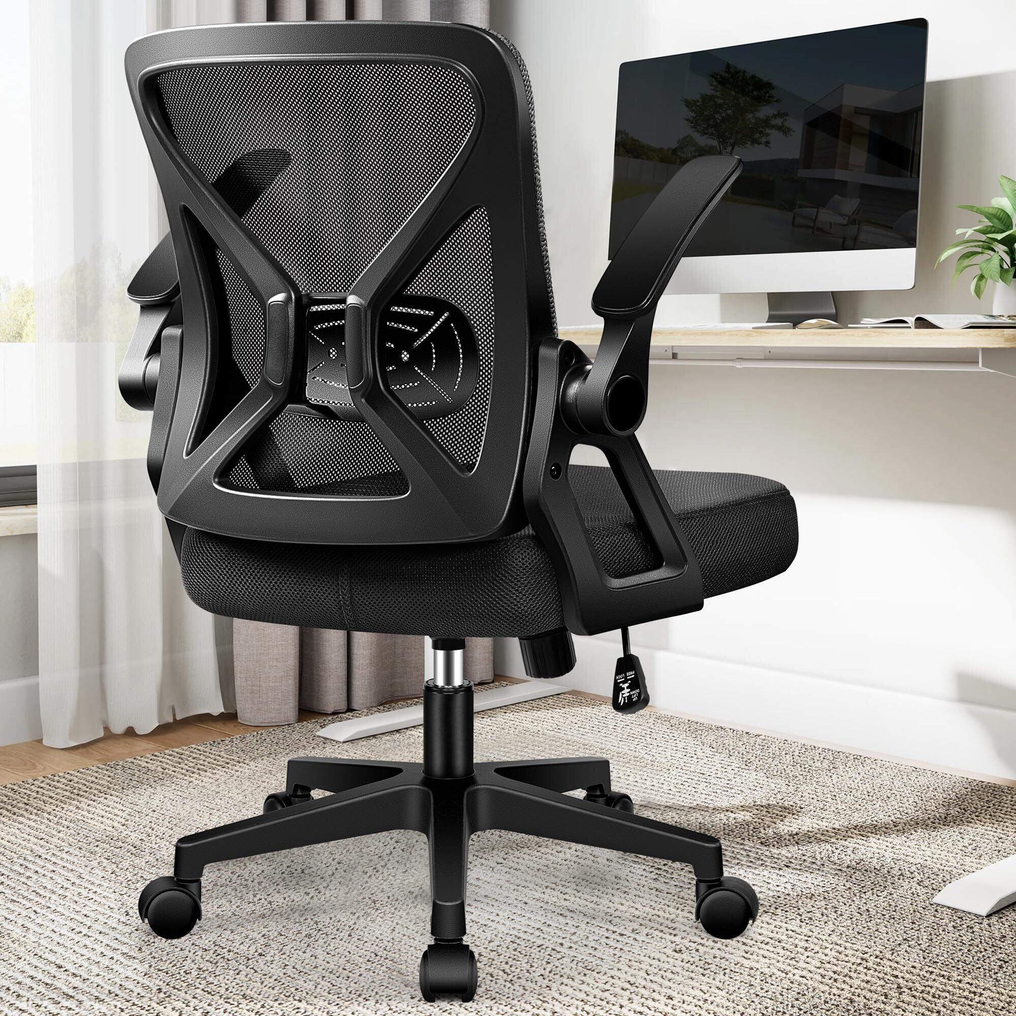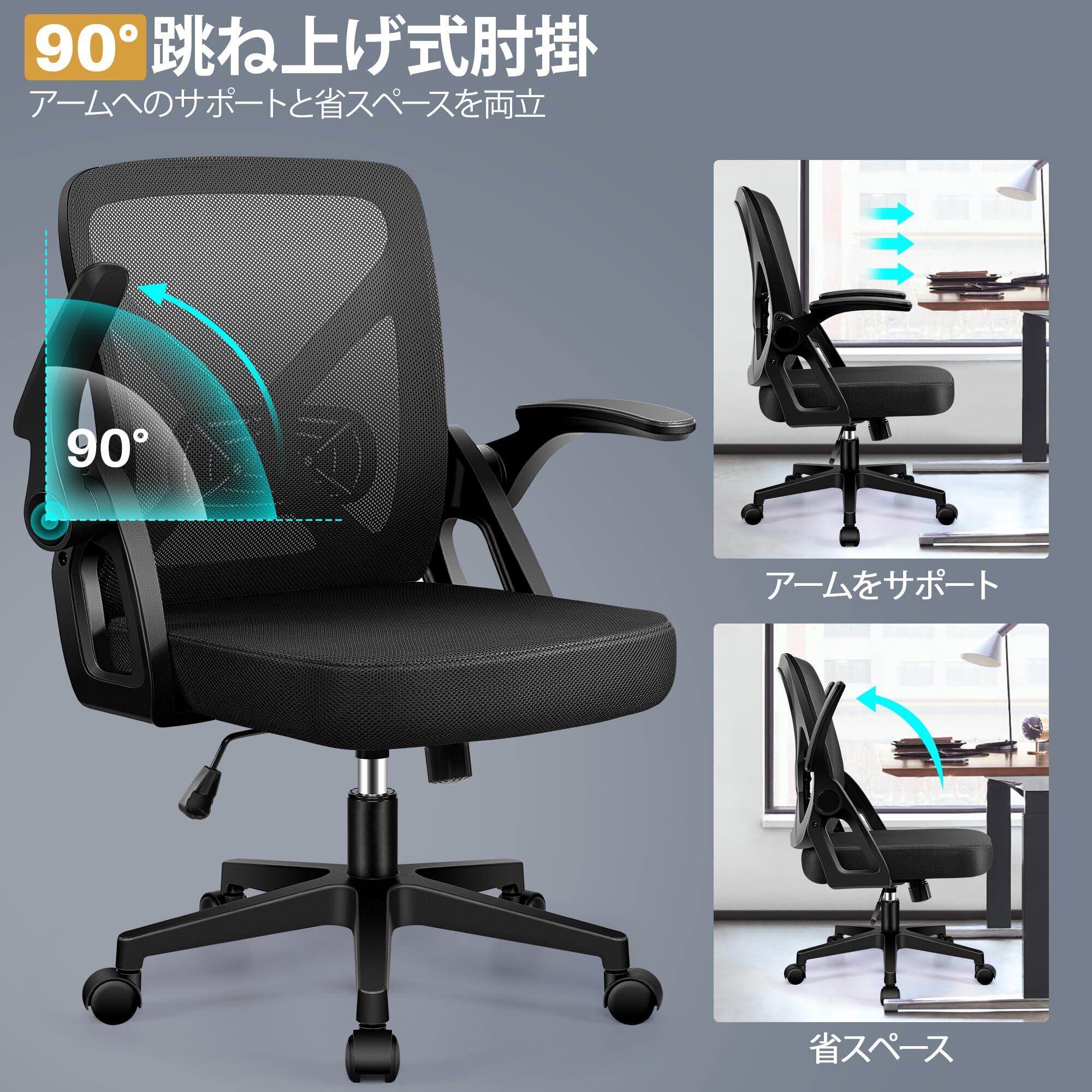 【2022最新】FelixKing デスクチェア オフィスチェア 椅子 テレワーク 疲れない 跳ね上げ式肘掛 コンパクト 調節可能 ロッキング pc 事務椅子 360度回転 通気性メッシュ 多機能 人間工学 ランバーサポート付き パソコン ブラック FK24-4-Black