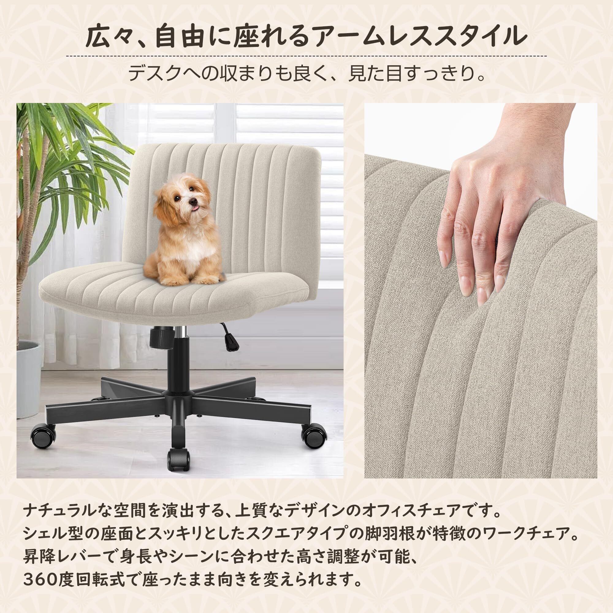 FelixKing デスクチェア あぐら 椅子 オフィスチェア 肉厚座面 布張り ソファチェア 肘掛けなし 疲れない 座面広い ホイール付き回転 10cm高さ調節可能 回転軽快な小型のソファ 一人掛け 小さなスペース 90°~120°ロッキング角度 キャスター付き パソコン 事務 学習 勉強 在宅 ワーク おしゃれ ベージュ