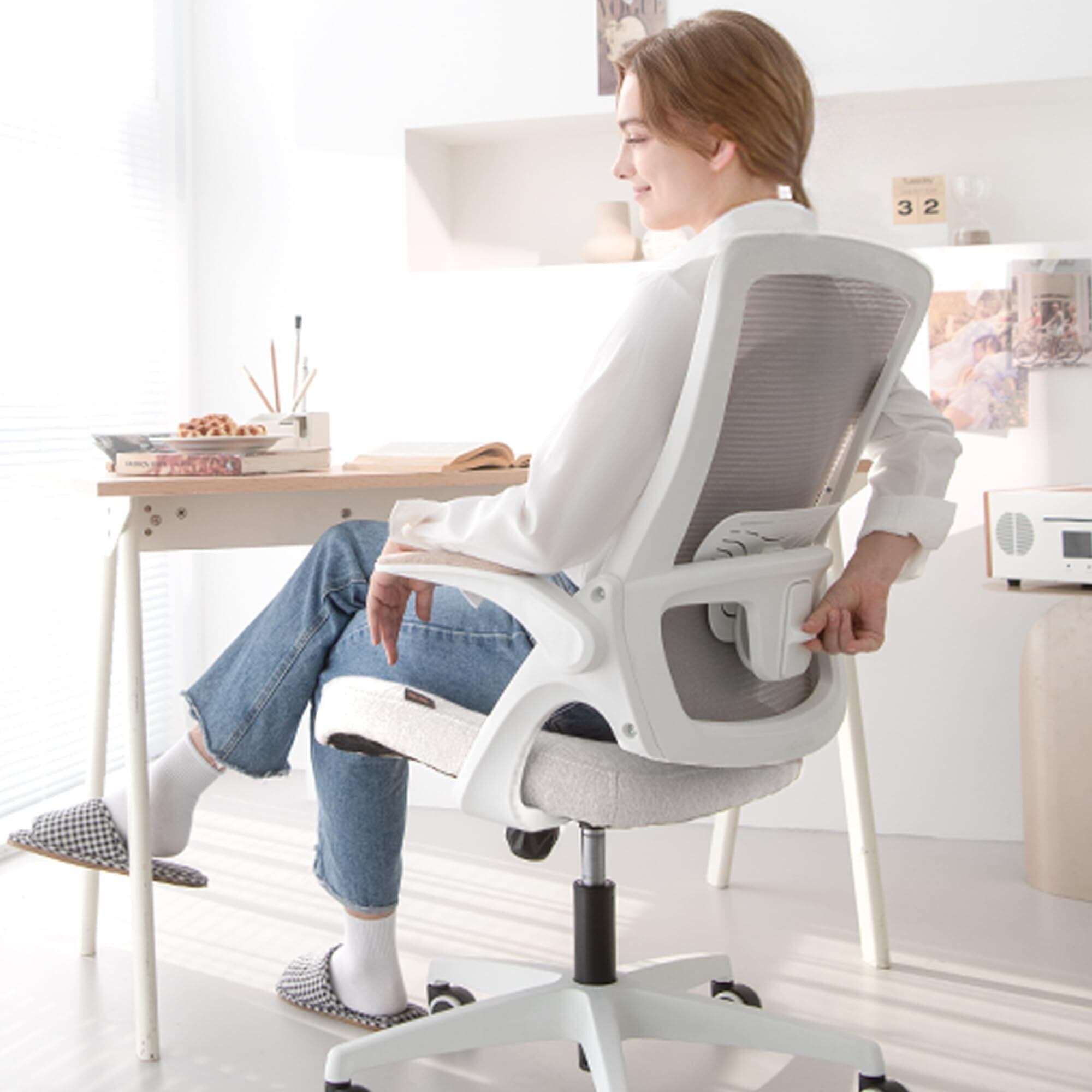 【跳ね上げ式アームレスト】昇降可能な便利なアームレストを搭載。アームレストを上げれば足を組んで自由に座ったり、デスク下に収納してスペースを削減できます。アームレストを下げれば、クッション入りアームレストが腕をサポートし、心地よい姿勢をキープ。