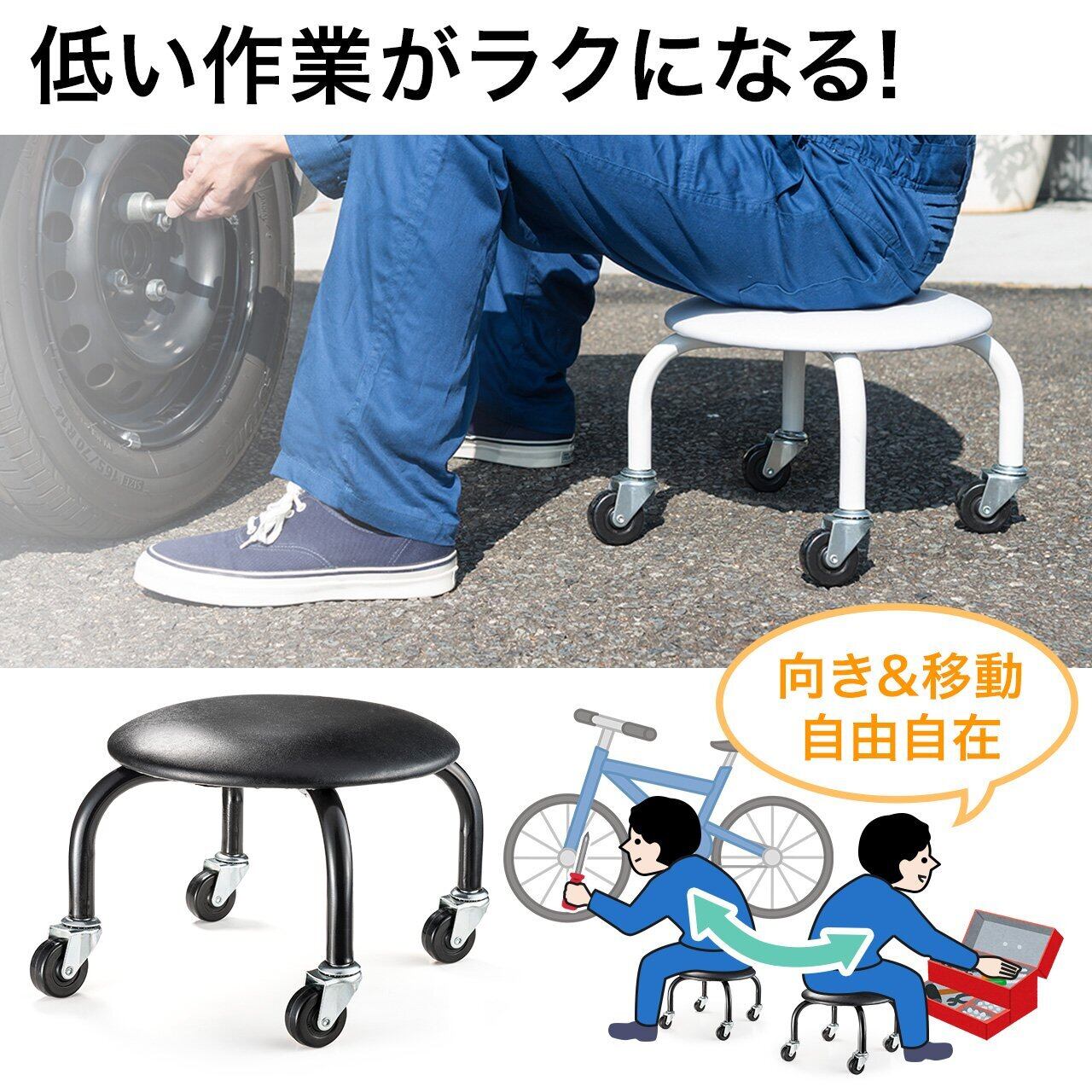 低い姿勢での作業が楽になる ロースツール です。自転車やバイクのメンテナンス、工場や倉庫、医療関連施設での作業に最適です。