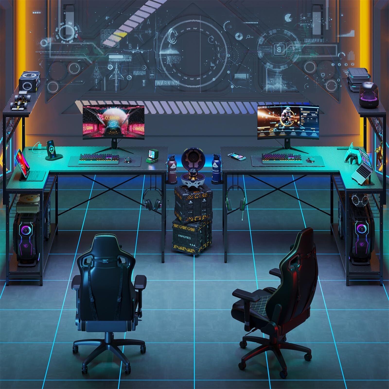 【新春セール】Bestier ゲーミングデスク l字デスク コンセント付き USB-C対応 パソコンデスク L字 幅107cm ゲームデスク LEDライト付き 机 pcデスク ラック付き 左右組み換え可能 学習机 勉強机 在宅勤務 カーボン調ブラック