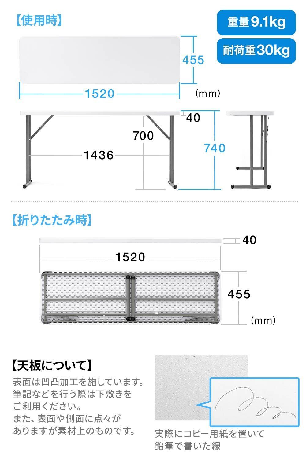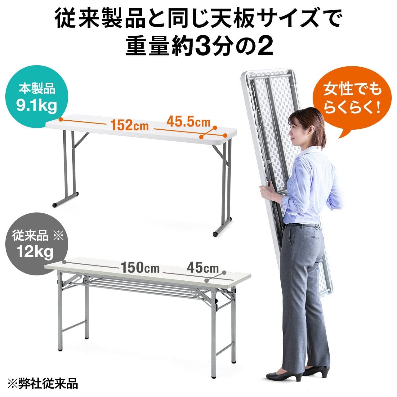 樹脂天板の為、木製天板の折りたたみテーブルより 軽量 です。
