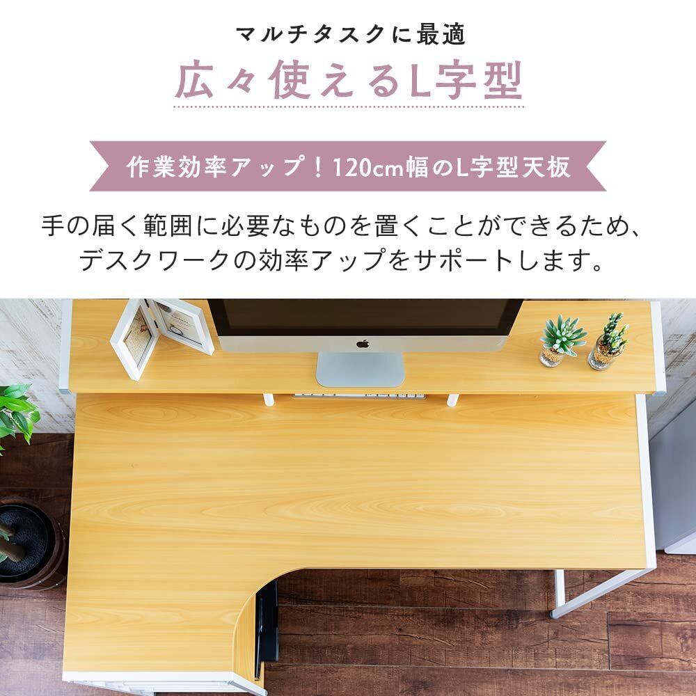 作業がぐっと快適になるL字デスクです。広々使える120cm幅のL字型天板で作業効率アップ。デスクトップとノートパソコンの2台使いにも最適な形とサイズ感です。モニターをディスプレイ棚に置けば、目線が約10cmアップ。目線を上げることで正しい姿勢を維持でき、長時間のデスクワークも快適に行えます。便利な2口コンセントも付いています。足下にはデスク周りをすっきりさせる大容量オープン収納。収納棚はお好みの高さで調整でき、左右どちらにでも設置可能です。※お客様組立。