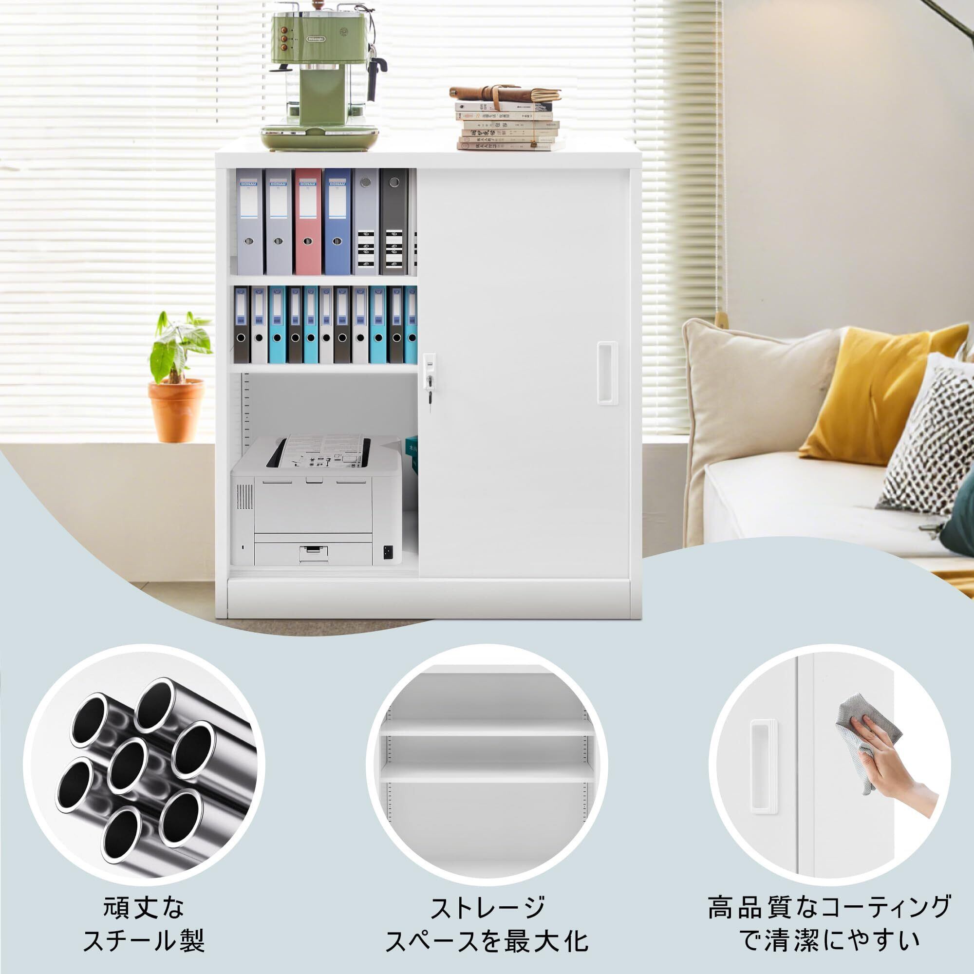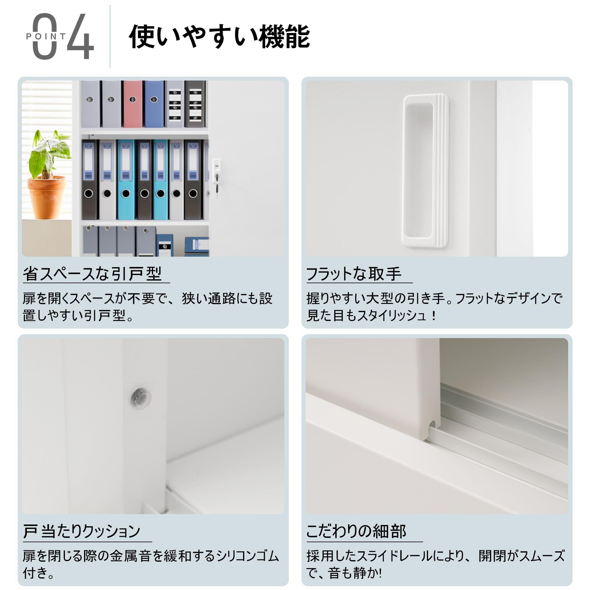 【引き戸タイプのスチール書庫】本製品は顽丈なスチール素材で作られて、表面には防錆コーティングを施しており、錆びにくいです。このスチールロッカーは引き戸タイプで、スペースを節約できます。両側に取っ手があり、操作しやすいです。引き戸タイプのデザインは片開きの方より使いやすいし、スペースを節約します。付属したの錠と鍵は完璧に盗難を防ぎます。法人、個人事業主様に最適です。