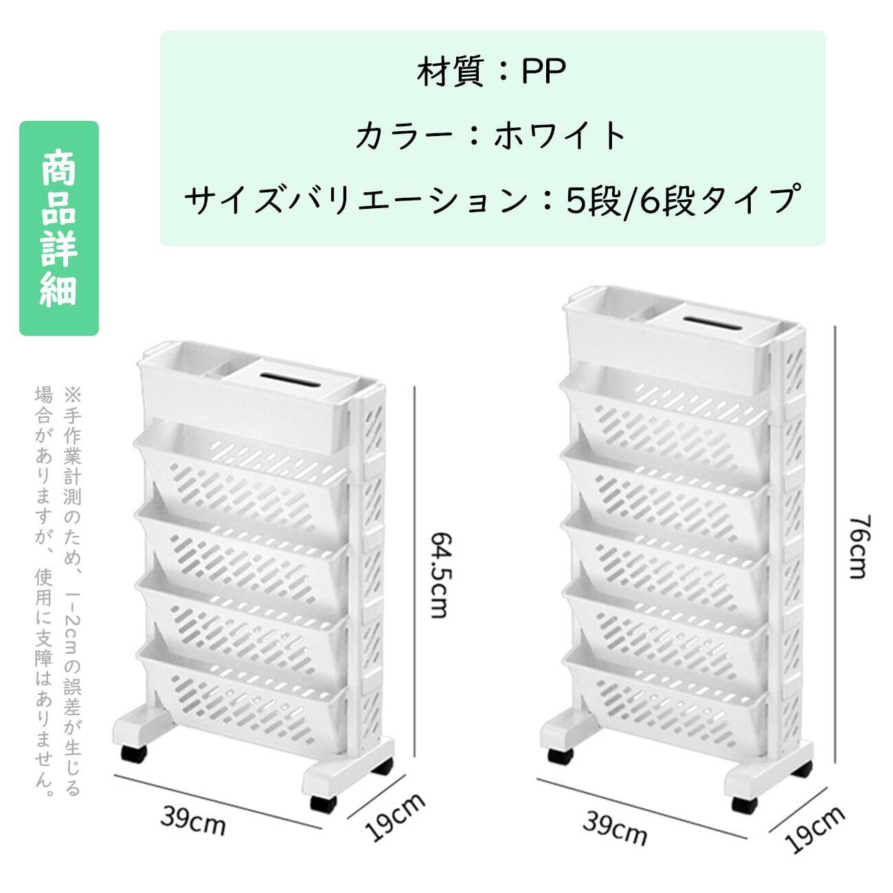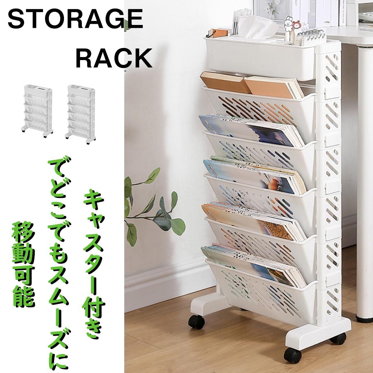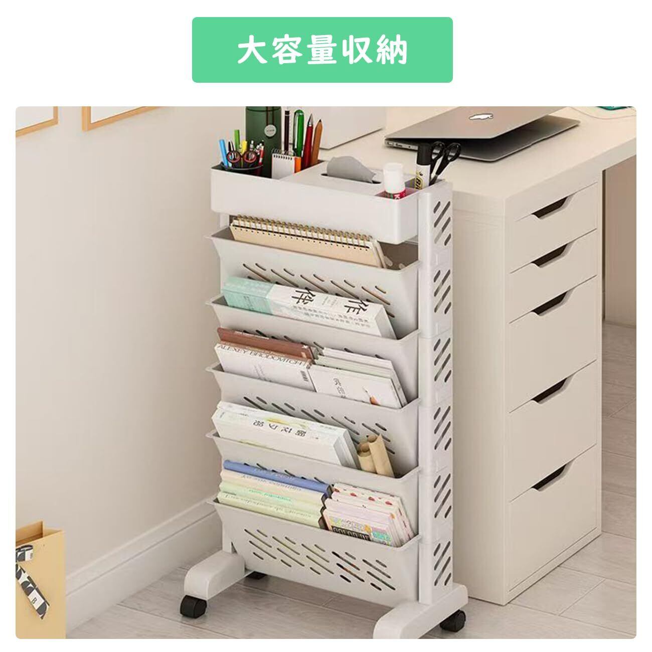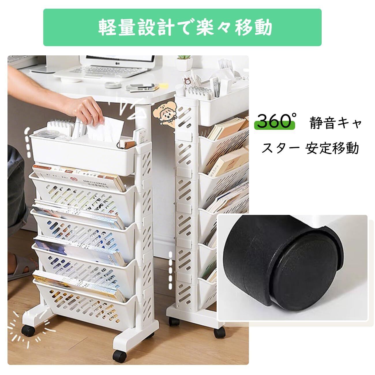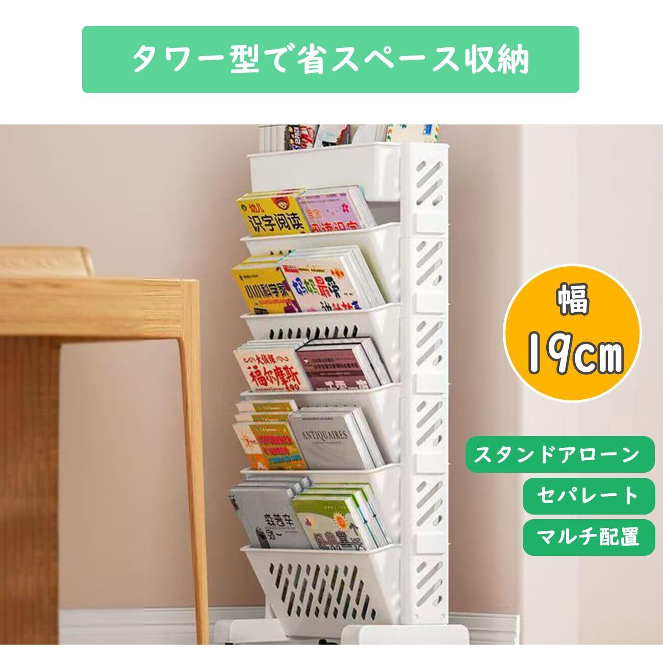 スリムでスタイリッシュな JUNHOTAI の本棚は、限られたスペースを最大限に活用できる5段マガジンラックです。高さ64.5cm、幅39cm、奥行19cmのコンパクトなサイズながら、本、漫画、雑誌などを効率的に収納できます。キャスター付きで移動が簡単なため、お部屋のレイアウト変更も自在。組み立ても簡単で、ホワイトカラーは様々なインテリアに調和します。家庭やオフィス、教室など、多目的に使用できる実用的な収納棚です。各段の収納スペースは用途に応じて本や雑誌を分類して整理整頓が可能。省スペース設計ながら十分な収納力を備え、スマートな空間演出を実現します。