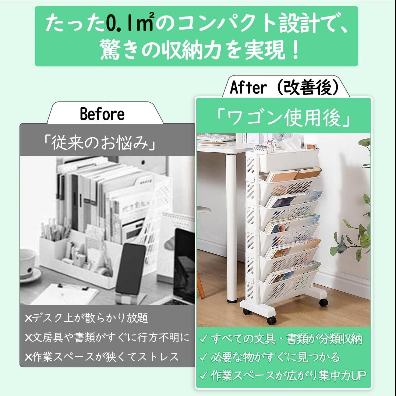 移動便利: キャスター付きで簡単に移動でき、レイアウト変更や掃除の際に便利