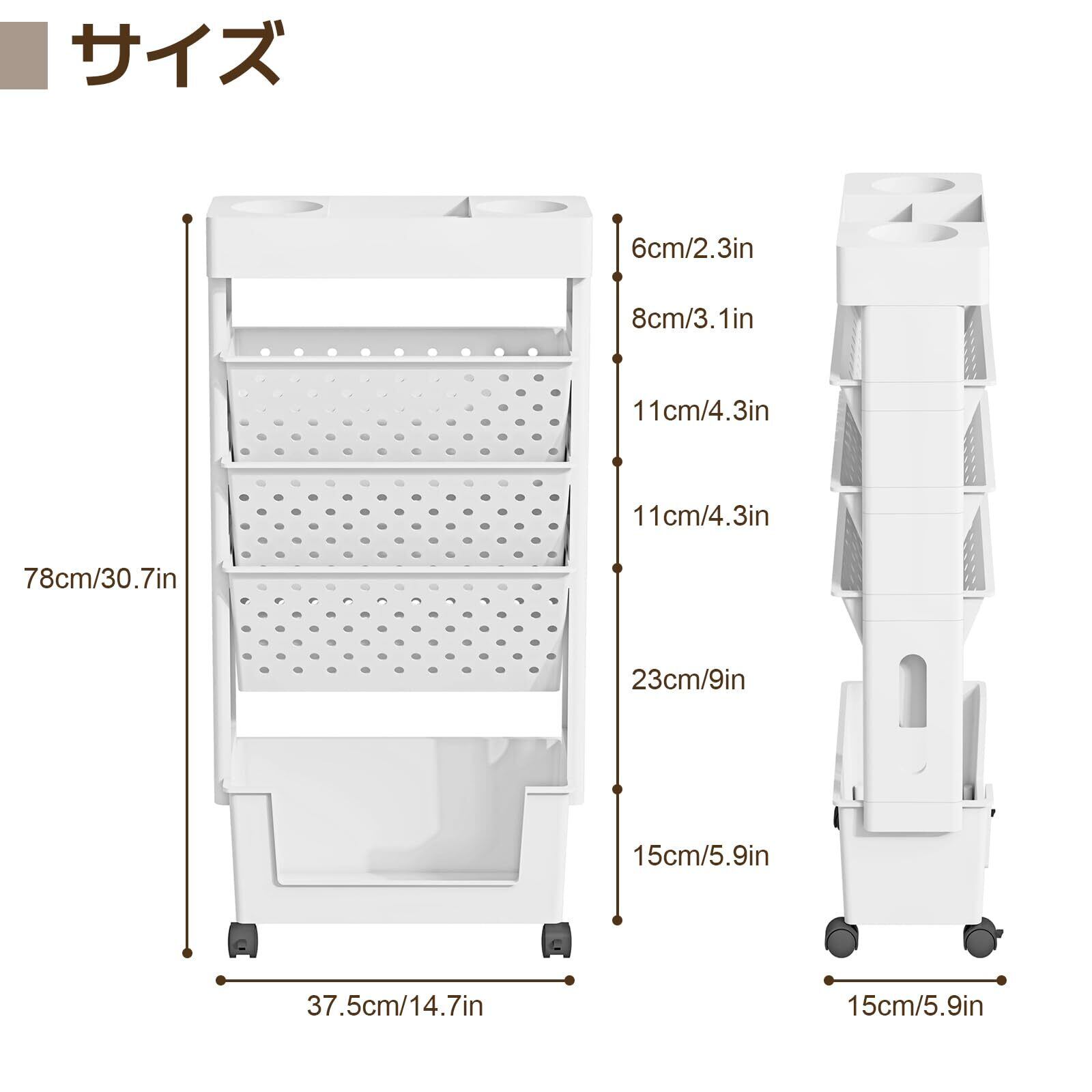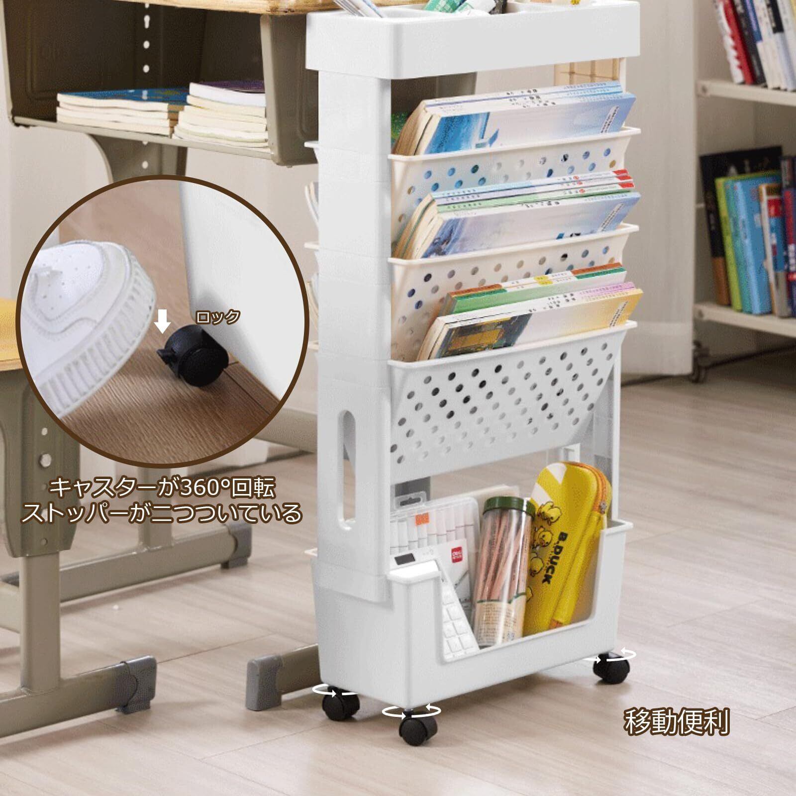 【多機能ゾーニング】5段のファイルワゴンとして、各棚耐荷重は約15kg、各段が様々な機能があります。まず、上段には水筒などに適用している丸い溝があって、もちろんペン立てとしてもピッタリです。そして、実用的な3段の棚は、教科書や漫画、絵本、マガジン、ファイル、CDなどをきちんと収納できます。底部は空間が大きいので、サイズ合う物をなんでも収納できます。