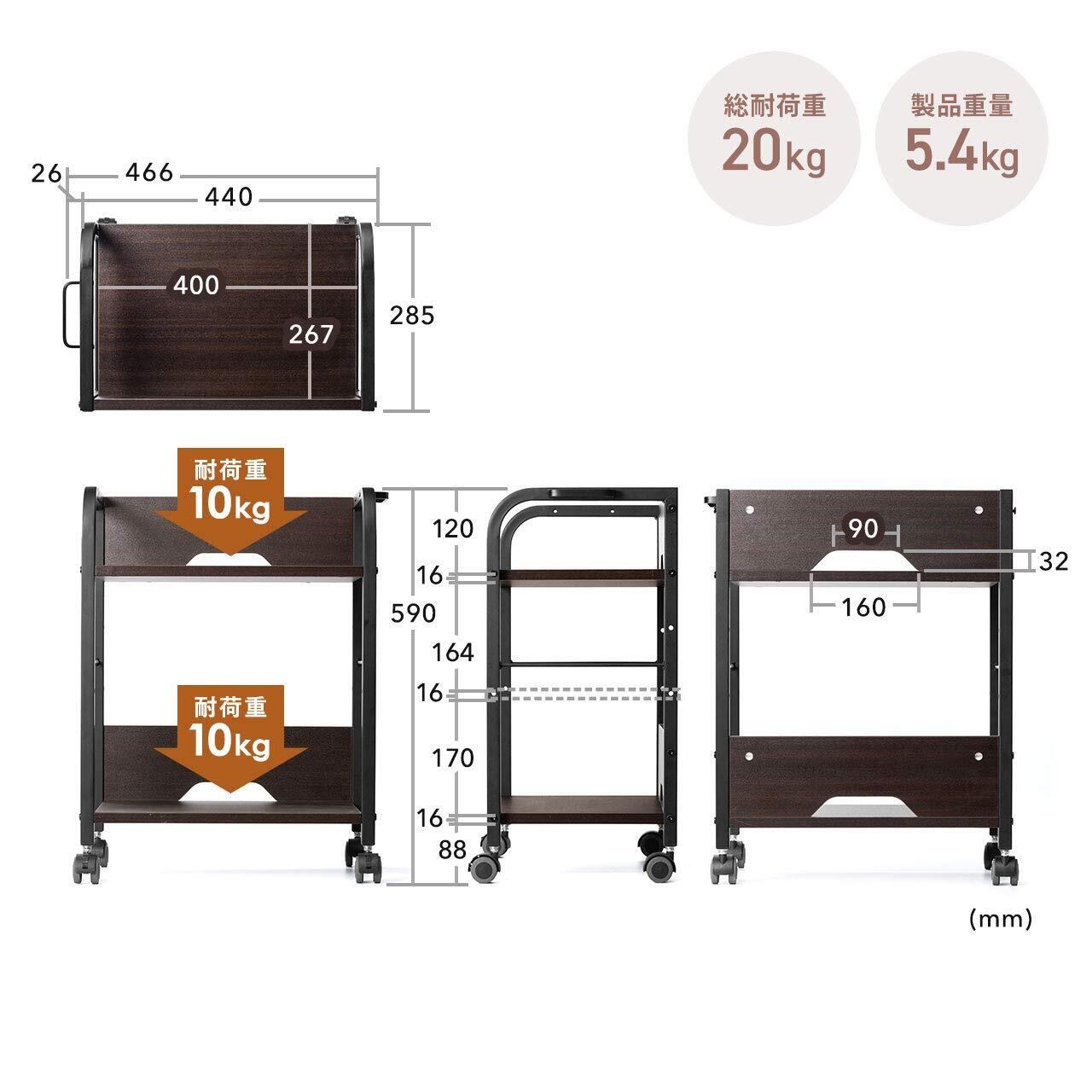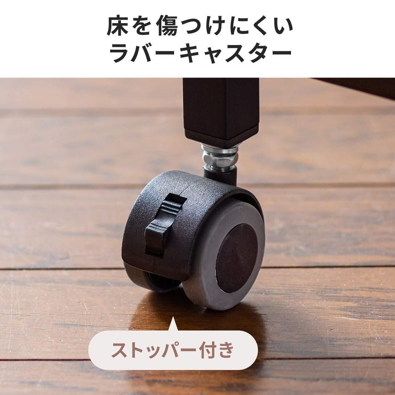 前側2個のキャスターにはストッパー付きです。総耐荷重は20kgで、書類や小物、プリンターなども設置可能です。