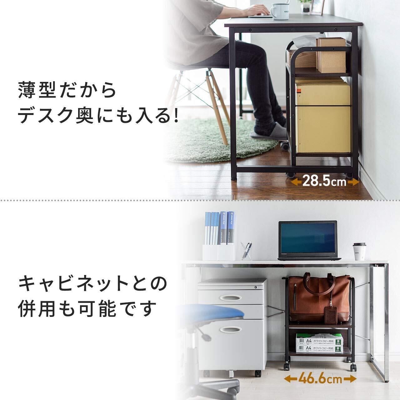 汚れに強いメラミン化粧板を使用し、落下防止バーで収納物が落ちにくいです。プリンター台としてや、クローゼット・押入れの整理用、ソファサイドラックとしても使用可能です。