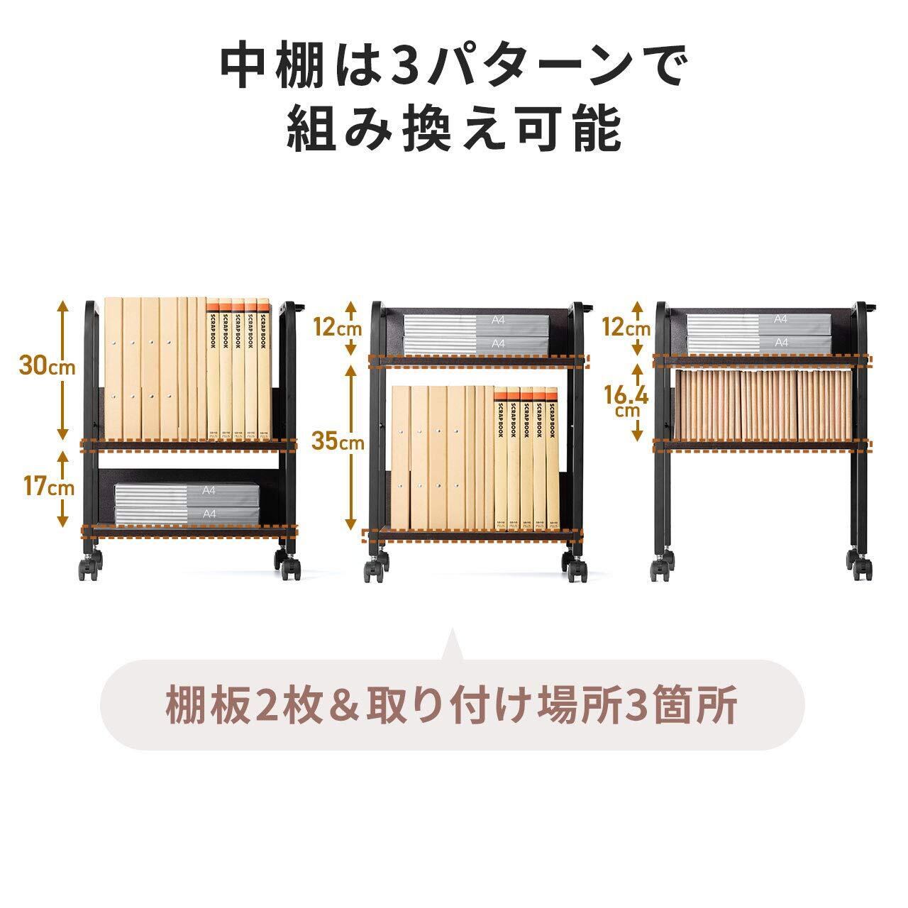 収納する物に合わせて中棚を3パターンで組み換えが可能です。キャスターが付いているのでちょっとした移動にも便利です。