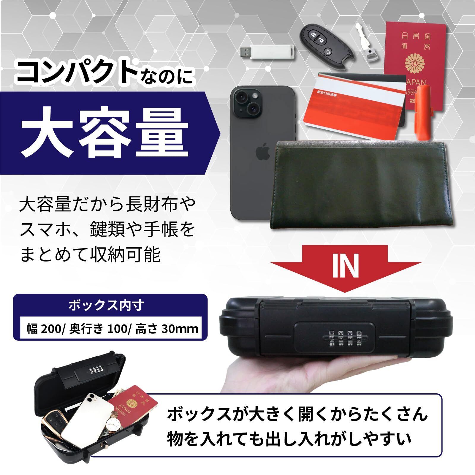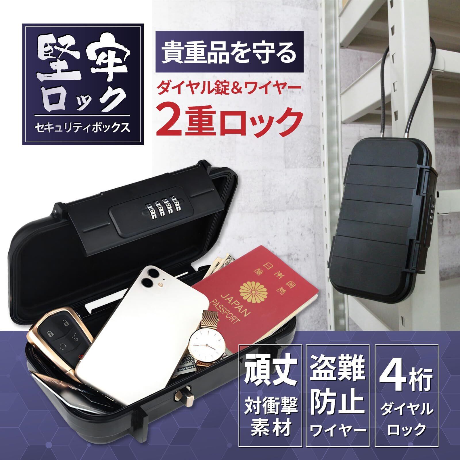 二重ロックシステム: 4桁のダイヤル式ロックと堅牢な留め具による二重のセキュリティで、貴重品を確実に保護します